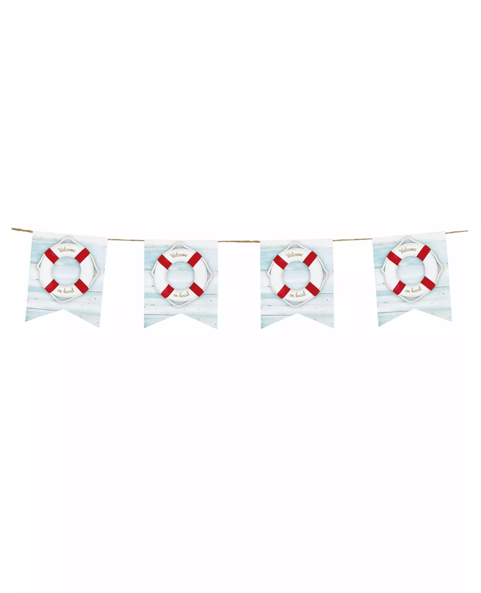 En dekorasjon som ikke faller i vannet! Dette nautiske banneret består av 11 dobbeltsidig trykte flagg. Girlanderen har vimpler dekorert med livbøyer på en hvit trebakgrunn. Den måler omtrent 4 m lang. Dette nautiske banneret er det perfekte tilbehøret som vil gi et veldig sommerlig preg. Det vil dekorere en fest med sjøtema. Inkludert tilbehør: Girlander Materiale: Papp