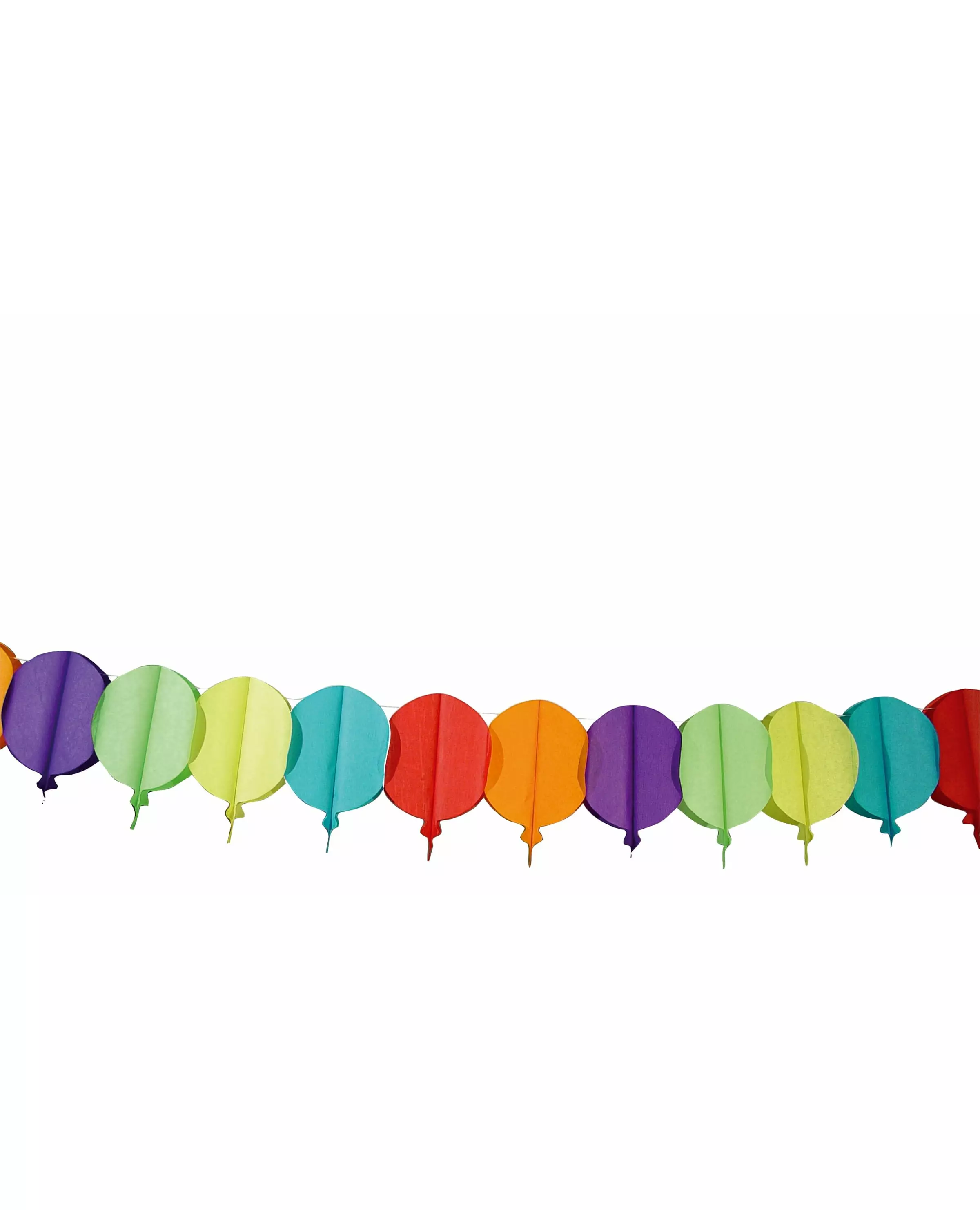 meter! Denne papirgirlanderen måler 4 meter og har ballongformede elementer i blått, grønt, lilla, rosa, gult og oransje. Ballongene måler hver 15 cm i diameter. Den integrerte snoren gjør at du enkelt kan brette den ut og henge den opp. Til en dåp eller bursdag vil denne girlanderen være perfekt for å sette farge på romdekorasjonen din. Inkludert tilbehør: 1 girlander Materiale: Papir