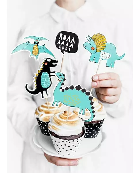 En tilbakekomst til dinosaurenes tid! Dette kakedekorasjonssettet består av 5 pappelementer. De måler mellom 10,5 og 20 cm. De representerer blå dinosaurer (4 dinosaurer) og et svart skilt med et dinosaurskrik! Under hver dekorasjon finner du en trepinne som du enkelt kan plassere på desserten din! Dette settet vil være ideelt for å dekorere kaken din til en dinosaur-tema bursdag! Inkludert tilbehør: 5 kakedekorasjoner Materiale: Papp