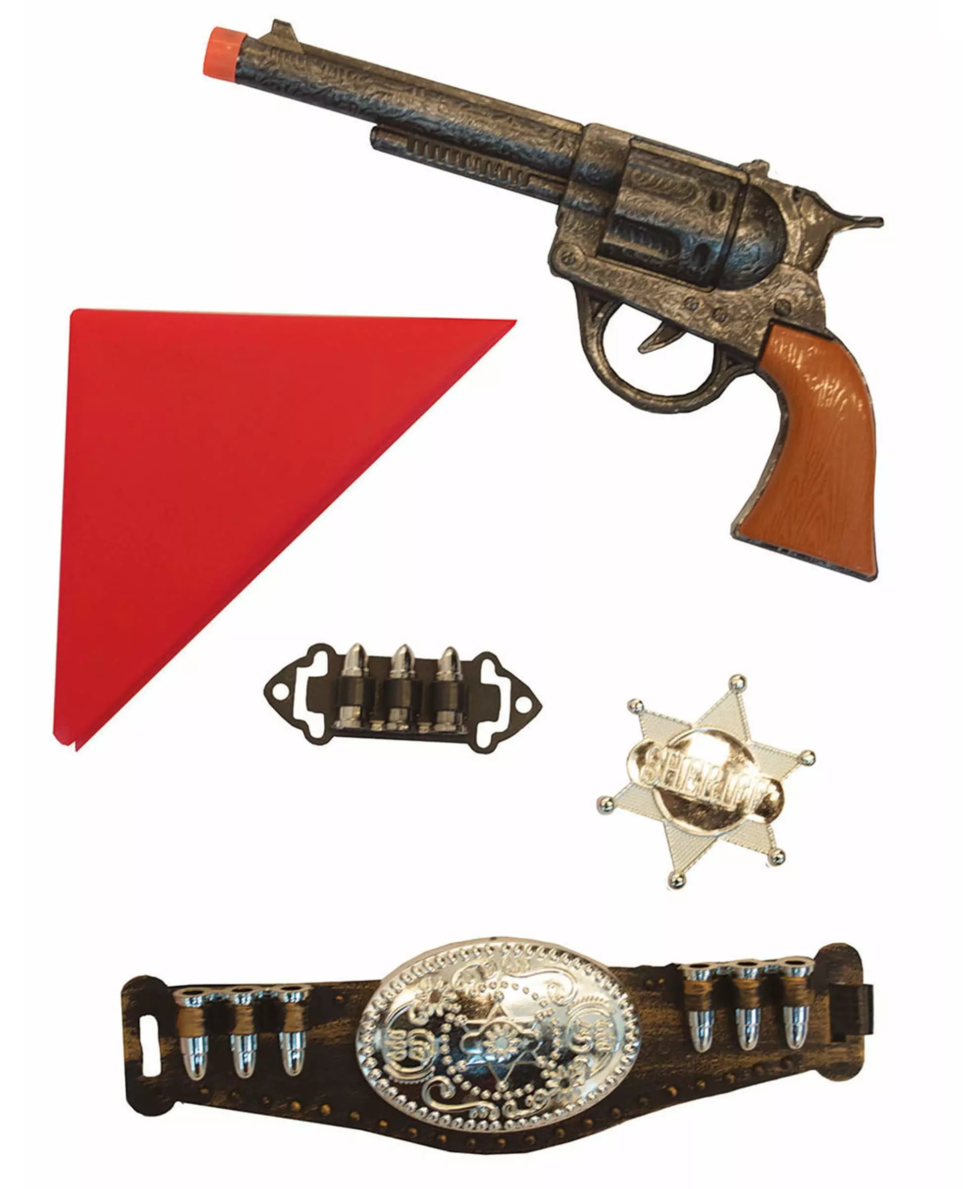 Dette cowboy-settet for barn består av 5 deler. I settet finner du en rød cowboy-bandana, en gravert pistol i tre- og metallutseende, et sheriffstjernemerke, et belte med kuler og ekstra ammunisjon. Med dette cowboy-settet fra Ville Vesten kan du fullføre cowboy- eller sheriff-kostymet ditt og holde orden på western-tema-fester. Inkludert tilbehør: Pistol-bandana Stjernebelte Ammunisjon Materiale: Polyester, plast