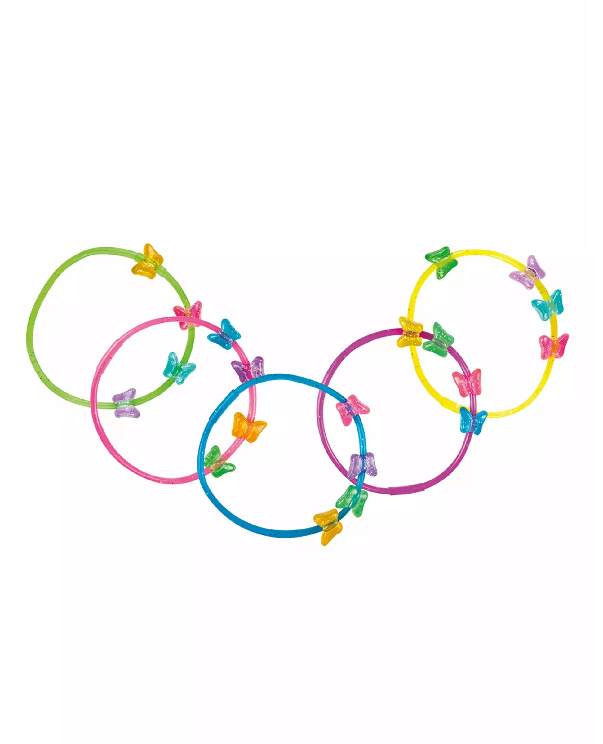 Små gaver Disse 5 fleksible armbåndene er tilgjengelige i tilfeldige farger. De er laget av plast og har gjennomsiktige sommerfuglformede perler med glitter. Disse små kostymesmykkene vil være perfekte gaver til datterens bursdag, for eksempel! Inkludert tilbehør: 5 armbånd Materiale: Plast