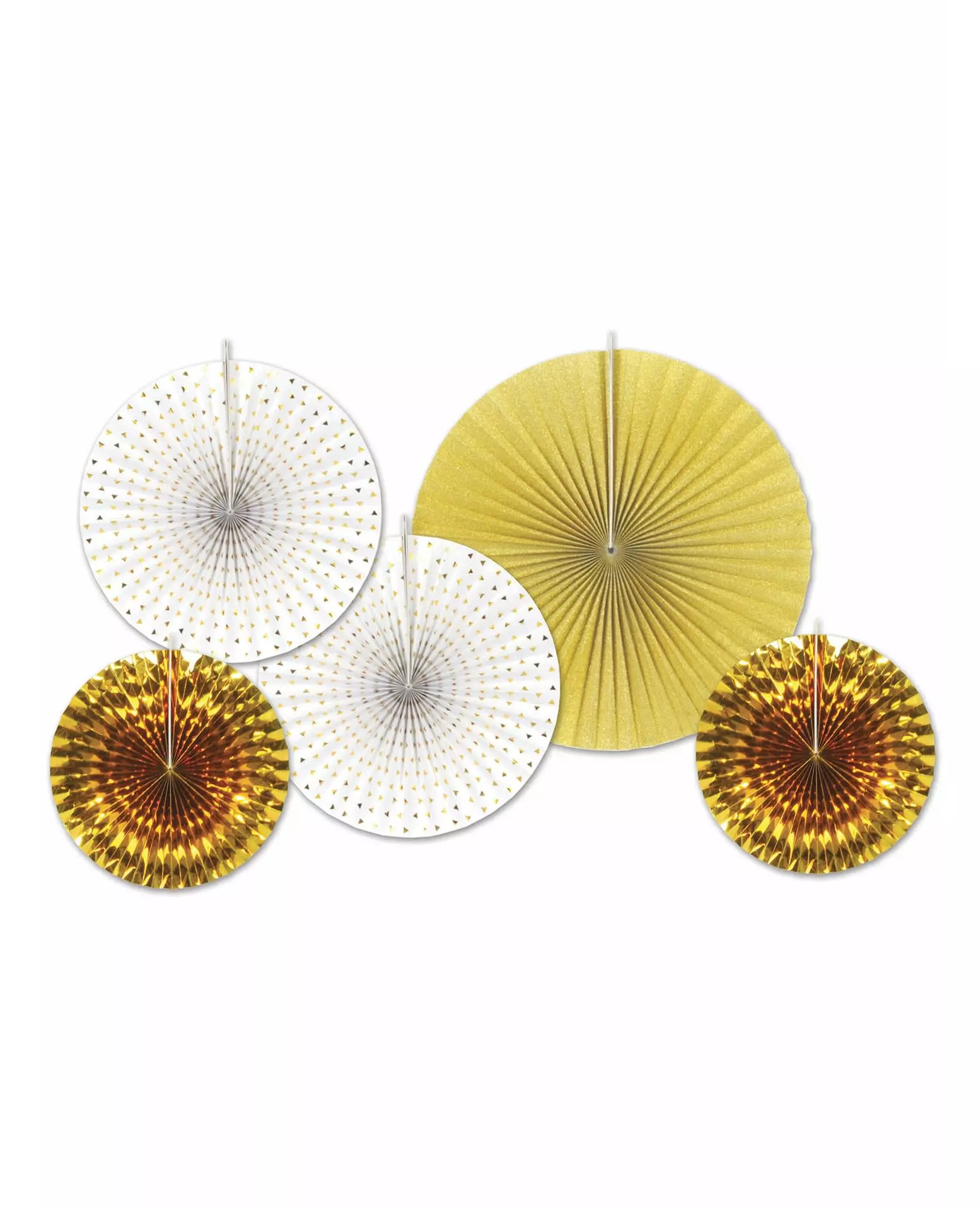 Perfekt for en fin dekorasjon! Dette settet består av 5 papirrosetter. Det er delt inn som følger: - 2 små metalliske gullrosetter, 24 cm i diameter - 2 hvite rosetter med gulltrekanter, 30 cm i diameter - 1 stor gullrosett, 40 cm i diameter Disse rosettene er trykt på kun den ene siden og hvite på baksiden. De henges enkelt opp med en snor. Dette settet vil være perfekt for å fullføre den festlige dekorasjonen din i et bryllup, til nyttår eller til og med jul. Inkludert tilbehør: 5 rosetter Materiale: Kartong