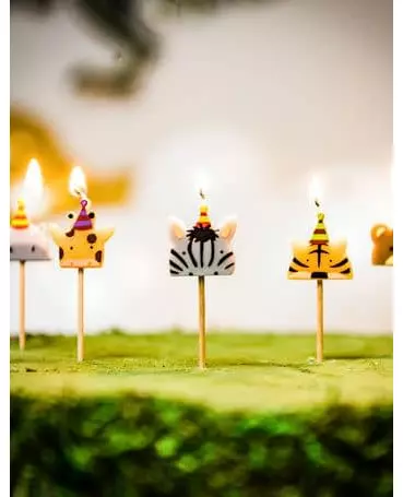 Dyr kommer til festen! Disse dyrelysene på pigger selges i pakker på 5. De måler omtrent 2,5 x 2,5 cm. Dyr er avbildet med festhatter: sjiraff, bjørn, flodhest, tiger og sebra. Pynt bursdagskaken din med disse lysene for et safaritema! Tilbehør inkludert: 5 lys