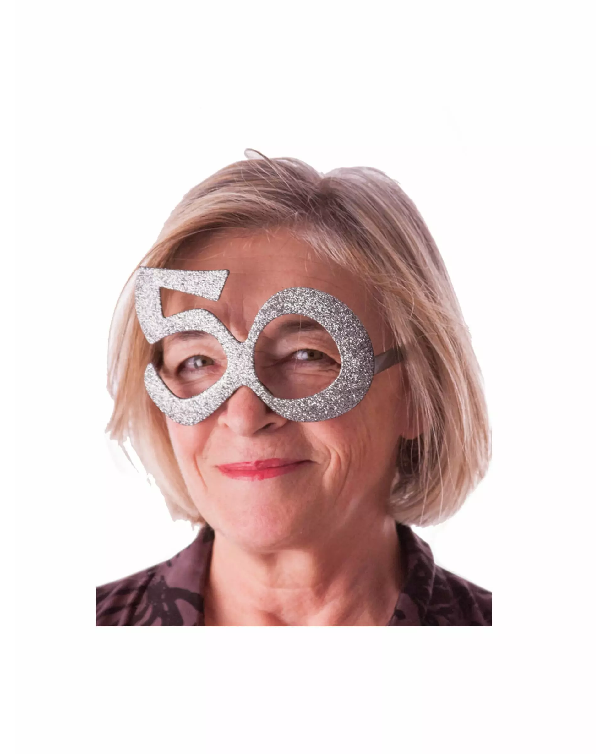 Glitterglass til 50-årsdagen Legg til et snev av humor i bursdagsfesten din. Disse 50-årsglassene er laget av plast. Innfatningen har tallet 50, dekket av sølvglitter.