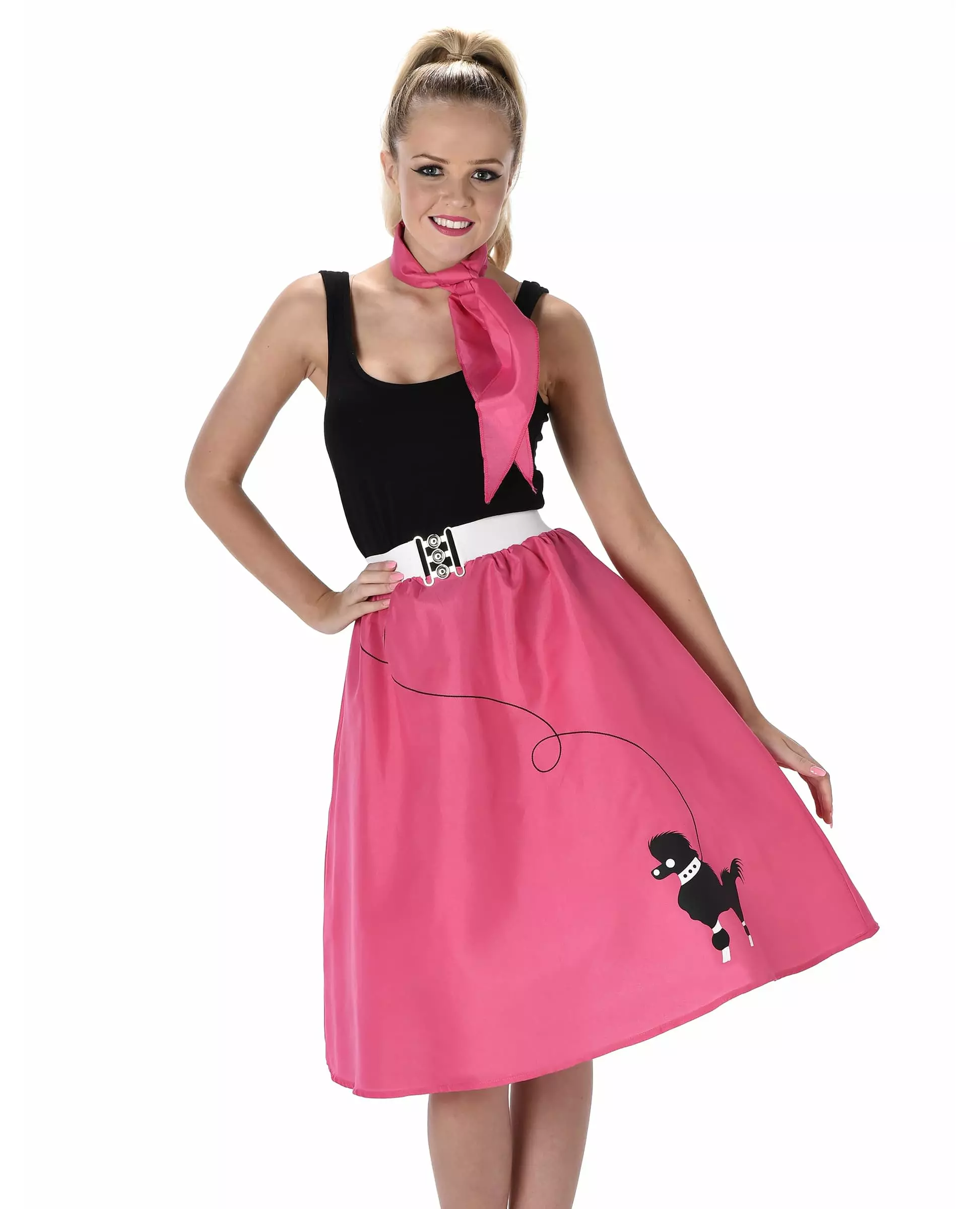 Rist hoftene til tonene av 50-tallet! Dette kostymet består av et skjørt med belte og et skjerf (topp og sko er ikke inkludert). Skjørtet er helt fuchsia-rosa med en liten svart flokket hund nederst til venstre. Det svært trendy midisnittet gir et retro-preg til antrekket! Det store hvite elastiske beltet fremhever midjen og lukkes med sølvspenner. Til slutt knyter du det rosa skjerfet rundt halsen for en garantert 50-tallslook! Ideelt for å slippe seg løs på dansegulvet til en 50-talls- eller filmtema-utkledningsfest! Inkludert tilbehør: Skjørt med belte Skjerf Materiale: 100 % polyester Vedlikehold: Håndvask Mål: For en størrelse S måler skjørtet ca. 64 cm.