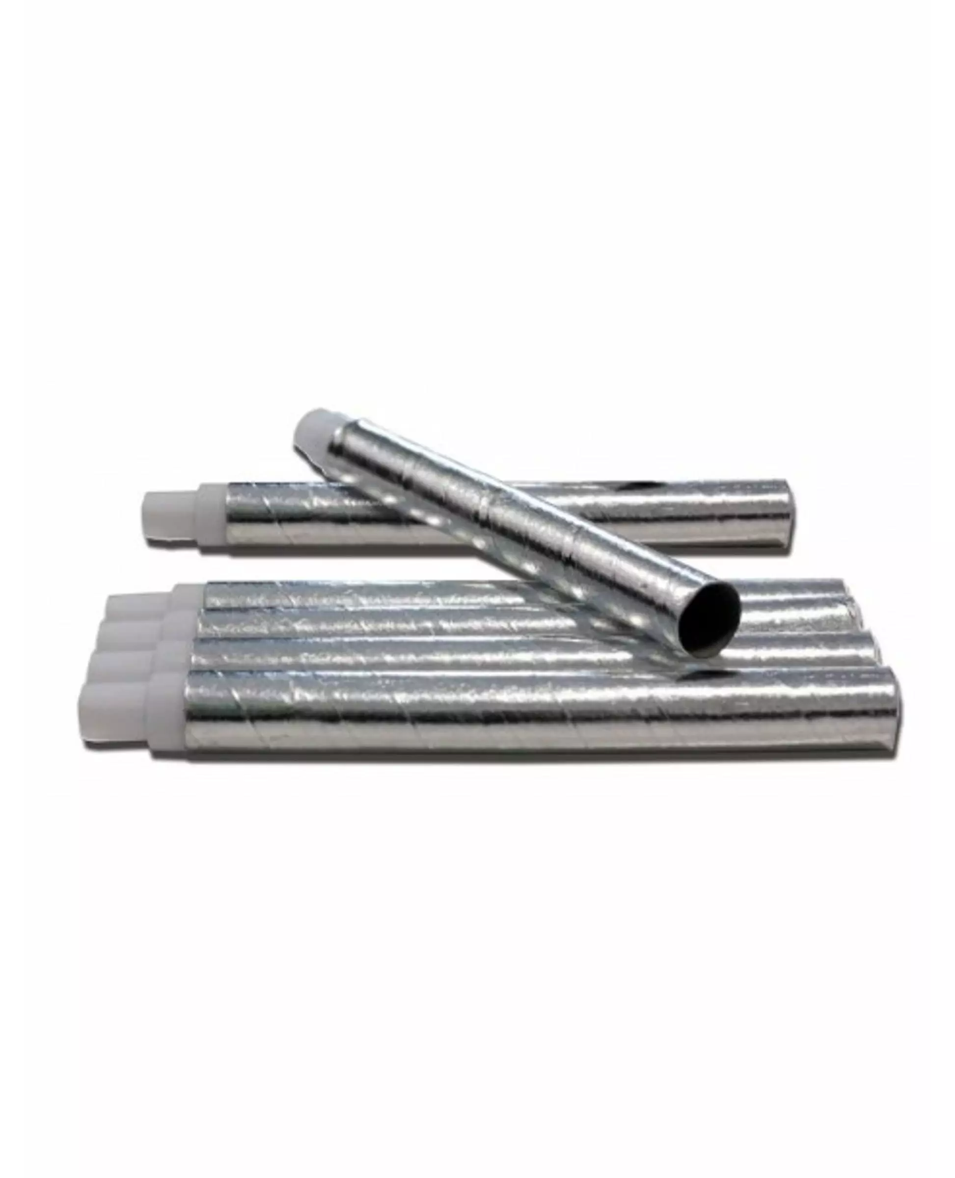 Blås hardt! Dette settet inneholder 6 sølvfargede pappblåserør. De måler omtrent 18 cm lange og 1,8 cm i diameter. De har en hvit plasttupp. Lag en original animasjon med disse blåserørene under kostymefester! Inkludert tilbehør: 6 blåserør Materiale: Papp
