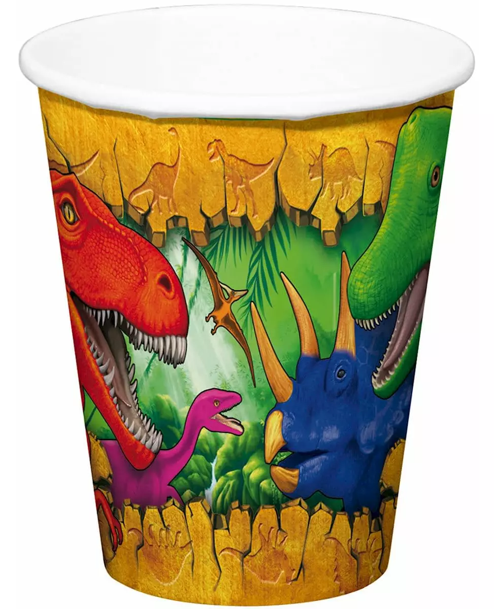 Mytiske skapninger! Dette settet består av 6 dinosaurkopper. Koppene rommer 250 ml drikke. De er dekorert med representasjoner av forskjellige dinosaurer. Disse forhistoriske skapningene er representert i jungelen. Barnet ditt vil bli glad for å skåle i selskap med disse berømte dyrene. Disse dinosaurpappkoppene vil fengsle barnet ditt og vennene deres på bursdagen deres. Inkludert tilbehør: 6 kopper Materiale: Papp