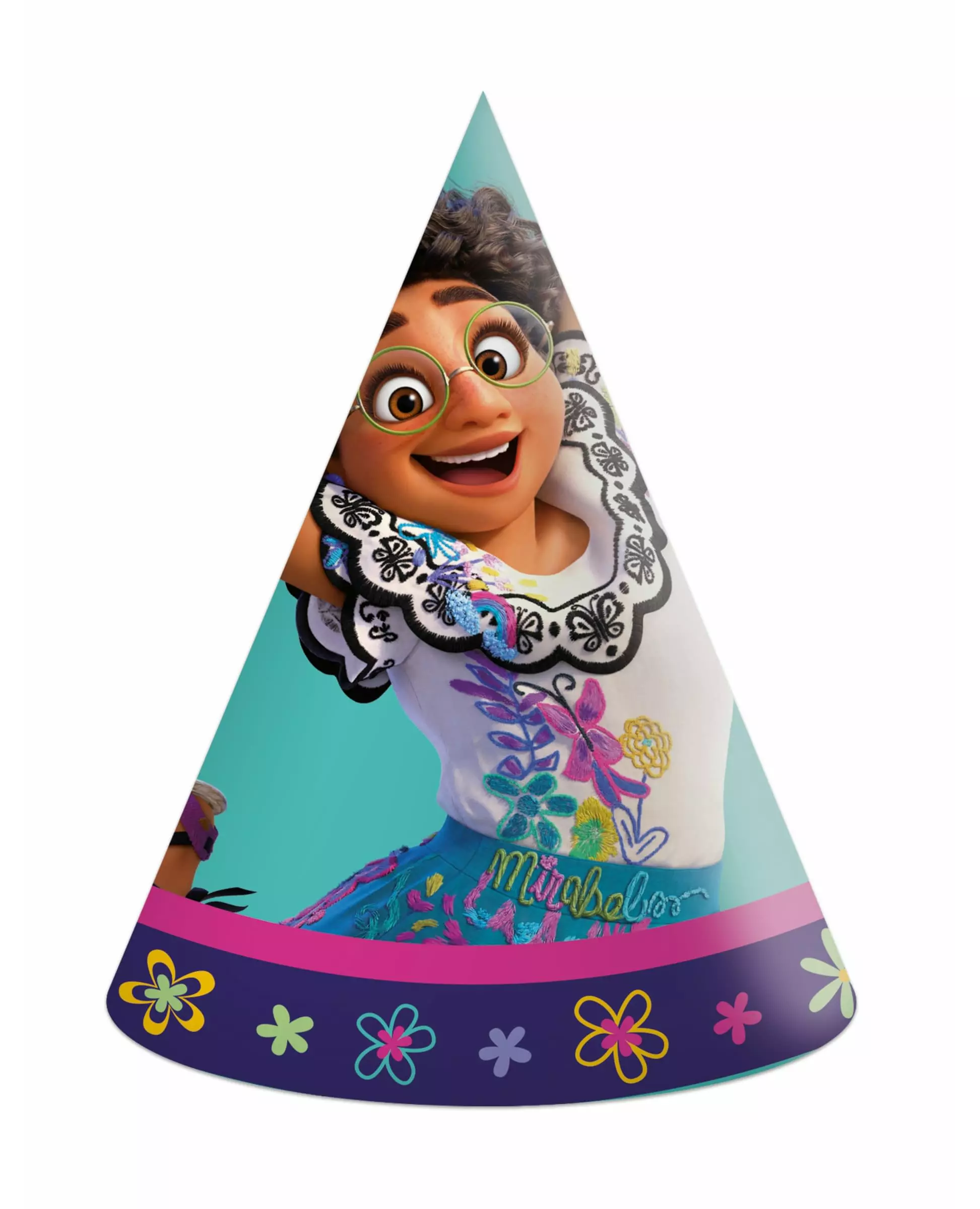 Ta på deg Encanto™-hattene! Disse hattene er offisielt lisensiert av Encanto™ og selges i pakker med 6. De er laget av papp og kjegleformet. Du finner den berømte Mirabel Madrigal™ fra Disney™-filmen på en blåaktig bakgrunn. Hattene finnes i flere farger (rosa, gul, blå, grønn osv.) med noen få blomster på undersiden. Denne pakken vil fullføre gjestenes antrekk på barnets bursdagsfest! Inkludert tilbehør: 6 hatter Materiale: Papp