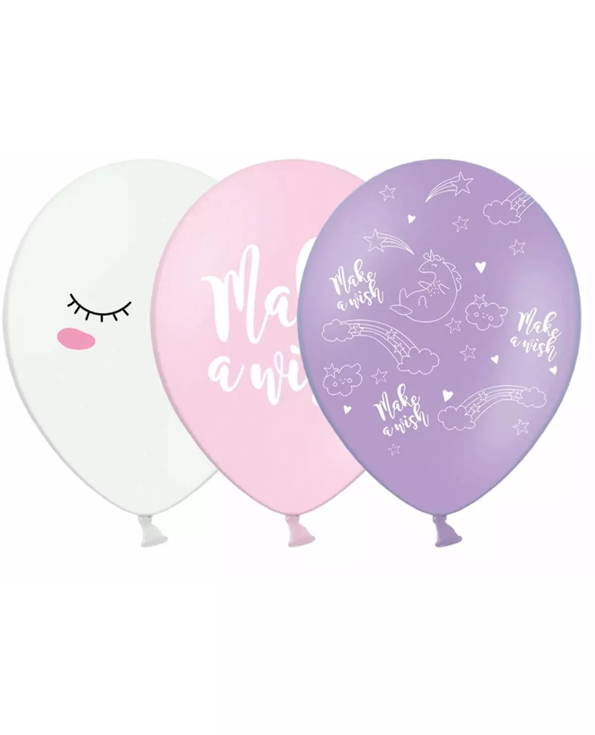Enhjørningsballonger for en jentete dekorasjon! Disse lateksballongene selges i pakker på 6. De er hvite, rosa og lilla med enhjørninger, stjerner, skyer og regnbuer og inskripsjonen «Make a wish». De er omtrent 30 cm når de er oppblåst. Dekorer rommet ditt med et enhjørningstema til en bursdag med disse ballongene! Inkludert tilbehør: 6 ballonger Materiale: Lateks