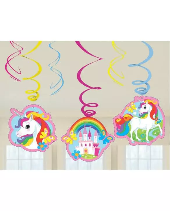 Den perfekte dekorasjonen til datterens bursdag! Dette settet inneholder 6 enhjørningsvirvler. Virvlene er laget av plast. Du finner 2 blå, 2 gule og 2 rosa virvler. En virvel i hver farge er festet til et pappklistremerke som forestiller en enhjørning, et enhjørningshode og et slott. Klistremerkene måler omtrent 15 x 13 cm. De er trykt på begge sider. Heng virvlene fra taket ved hjelp av den medfølgende maljen og lag en fantastisk dekorasjon til datterens bursdag! Inkludert tilbehør: 6 virvler Materiale: Papp, plast