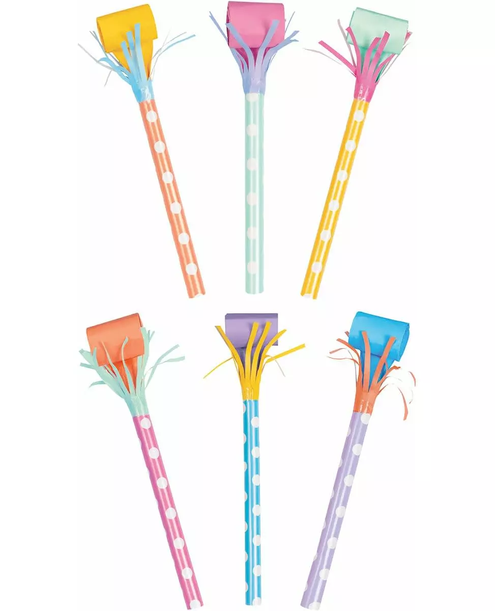 For en fargerik fest! Dette settet består av 6 fargerike flip-flops. De har en prikkete stilk å blåse i, fargerike frynser og en flik som rulles ut. Feir nyttår eller en bursdag med disse fargerike flip-flopsene! Inkludert tilbehør: 6 flip-flops