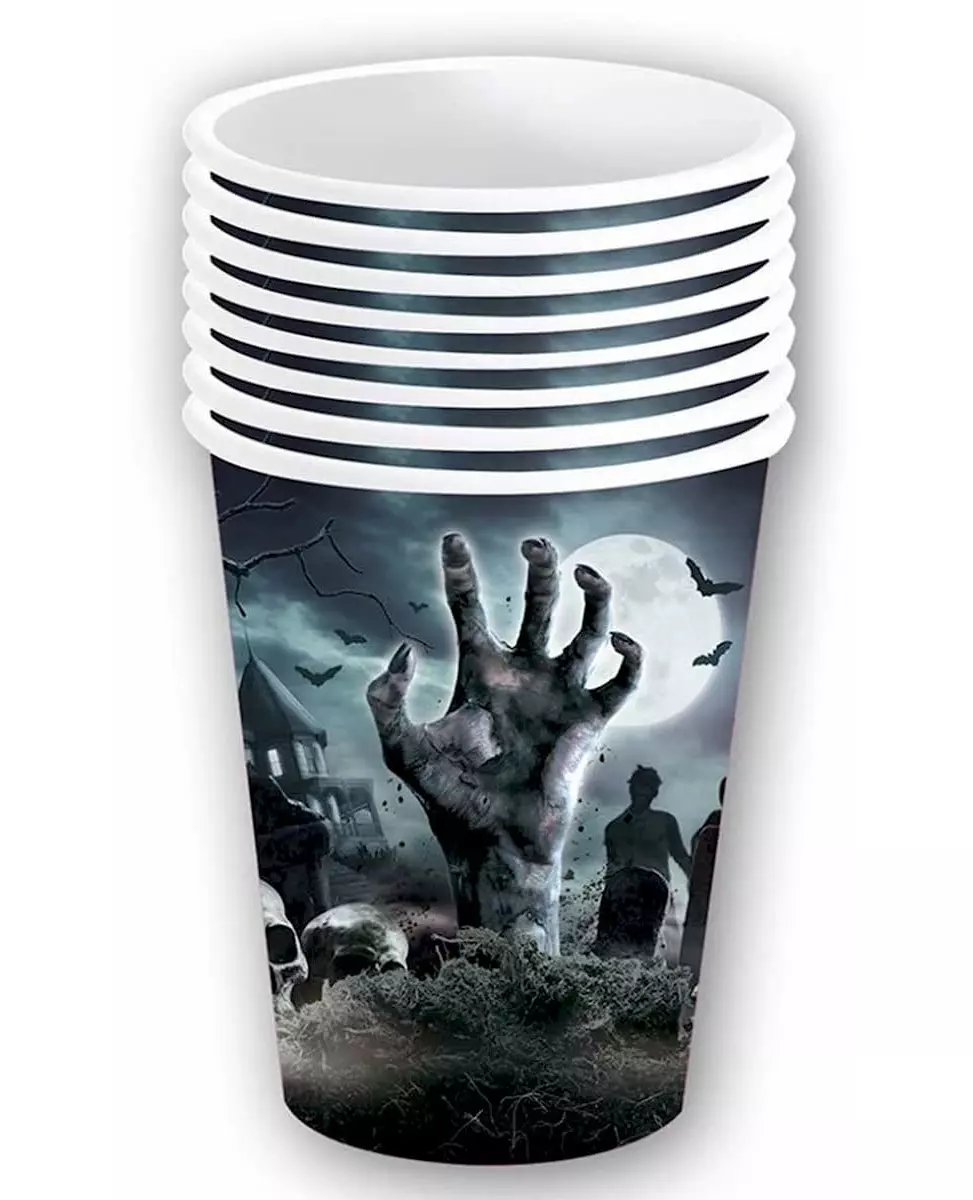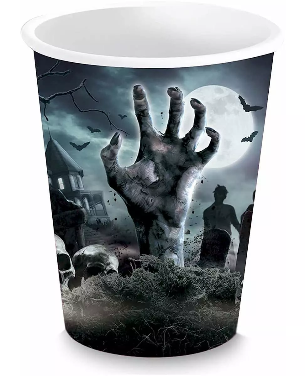 Dra til kirkegården for Halloween! Dette settet inneholder 6 pappkrus med en kapasitet på 240 ml. Hver kopp har en avbildning av de døde som står opp fra gravene sine på en fullmånenatt. Disse pappkrusene er perfekte for å pynte opp Halloween-bordet ditt! Inkludert tilbehør: 6 kopper Materiale: Papp