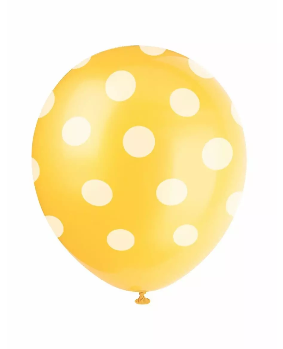 Sett farge på festen din! Dette settet inneholder 6 gule ballonger med hvite vekter. Disse ballongene er laget av lateks og måler 30 cm i diameter når de er oppblåst. De vil være ideelle for å sette farge på en sommerfest eller bursdag. Unik festlogo. Materiale: Lateks