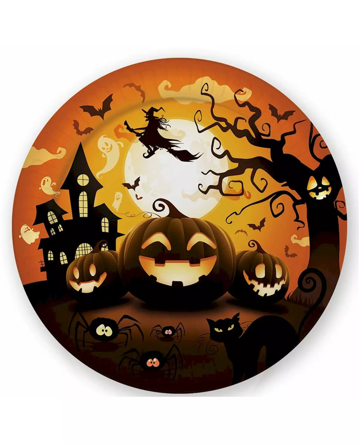 Gjør Halloween-bordet ditt komplett! Dette settet inneholder 6 Halloween-gresskartallerkener. De er laget av papp og måler omtrent 23 cm i diameter. De har flere Halloween-temamønstre med gresskar, edderkopper, flaggermus osv., alt på en oransje bakgrunn og en mørkere side på den nedre delen. Gjør borddekorasjonen til Halloween-festen komplett! Inkludert tilbehør: 6 tallerkener Materiale: Papp Vedlikehold: Ikke vask