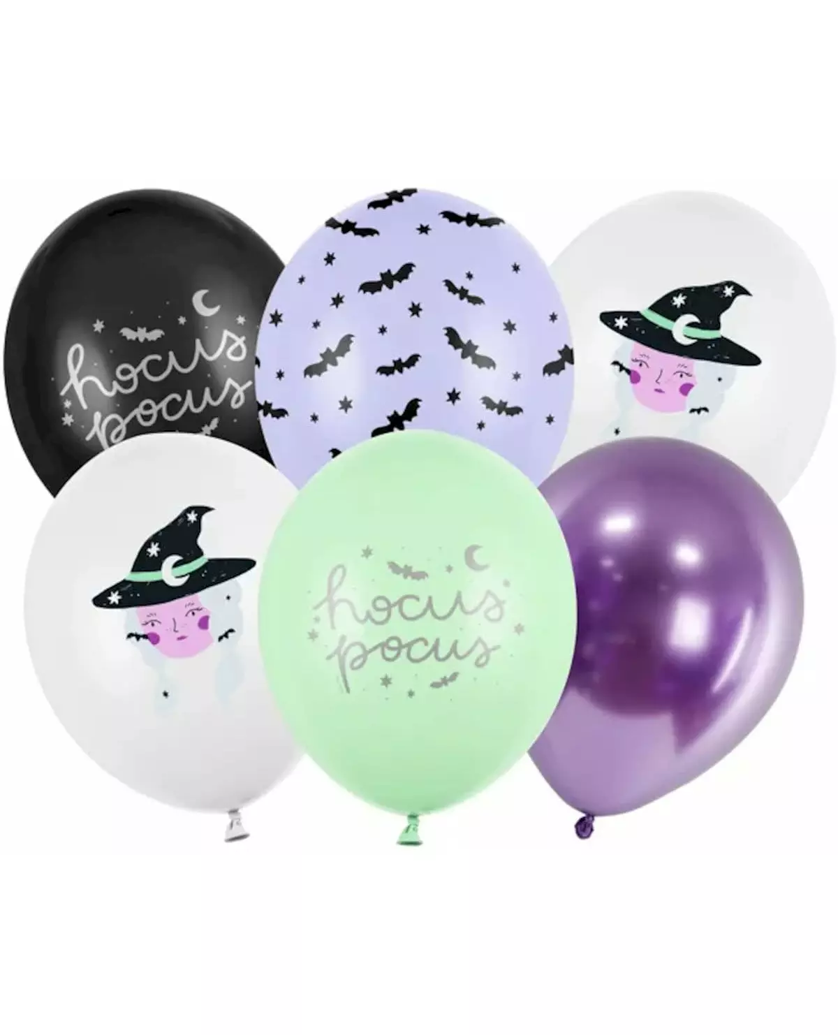 Hokus pokus! Dette settet består av 6 lateksballonger. De er omtrent 30 cm store og kommer i forskjellige farger: 2 hvite ballonger dekorert med en heks, en svart ballong og en grønn ballong med ordene «hokus pokus», en metallisk lilla ballong og en lilla ballong dekorert med flaggermus. Fullfør din heksetema Halloween-dekorasjon med disse lateksballongene! Inkludert tilbehør: 6 ballonger Materiale: Lateks
