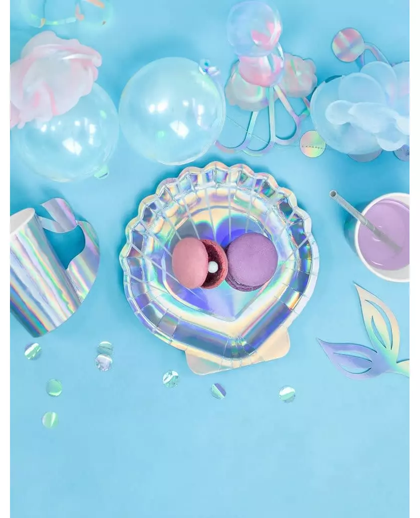 Vakre perlemoraktige refleksjoner! Disse 6 tallerkenene er skjellformede. De måler omtrent 18,5 cm i diameter og er laget av papp. De er iriserende i lilla og blå nyanser. Disse skjelltallerkenene vil perfekt utfylle en borddekorasjon til en fest eller bursdag med havfrue- eller andre marine dyr-tema. Inkludert tilbehør: 6 tallerkener Materiale: Papp