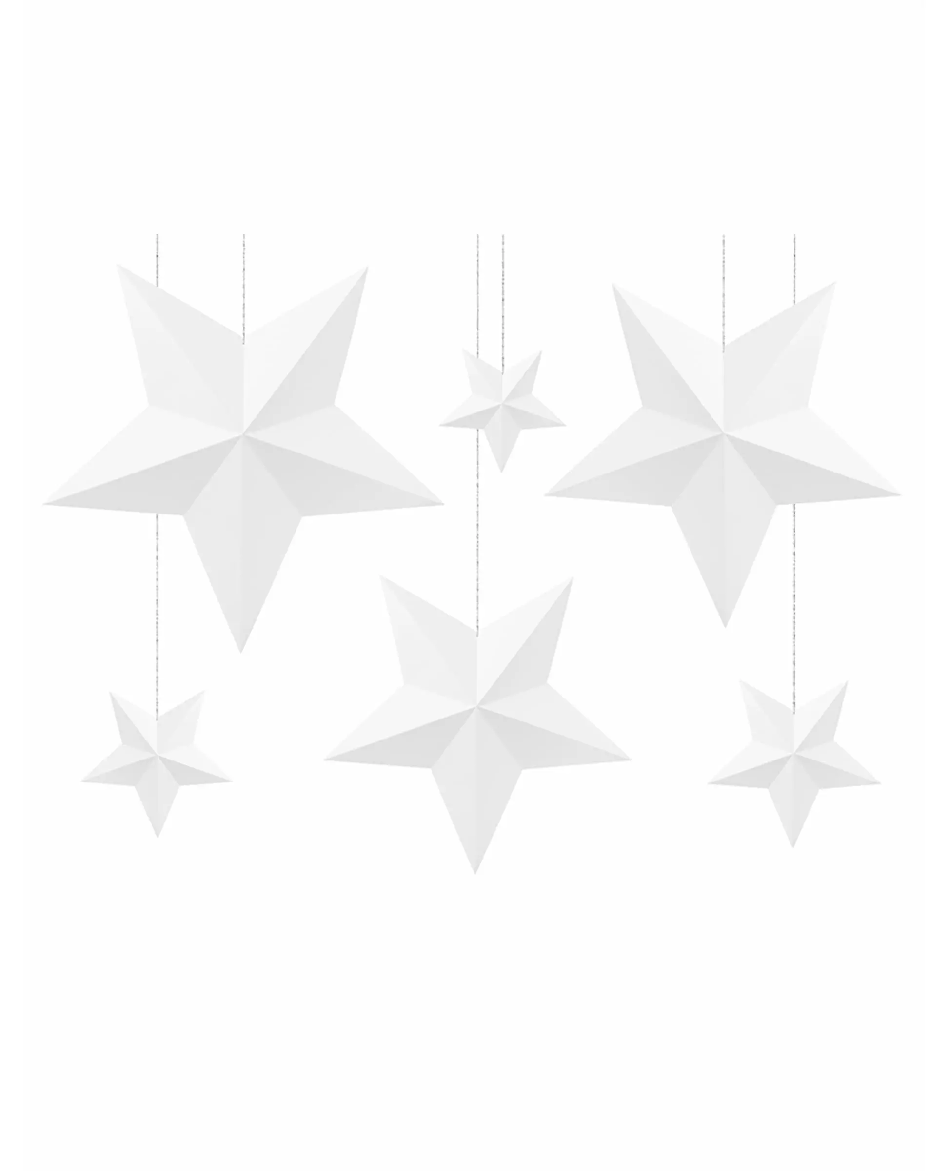 En myk og stjerneklar juledekorasjon! Dette settet inneholder 6 hengende stjerner og en rull med hyssing. De er laget av hvit papp og kommer i forskjellige størrelser: den minste måler omtrent 12 x 11,5 cm og den største omtrent 37 x 35 cm. De har en 3D-effekt. De har en åpning øverst for å føre sølvsnoren gjennom. Disse hengende stjernene vil være perfekte til juledekorasjonen din!. Inkludert tilbehør: 6 stjerner 1 rull med hyssing Materiale: Papp, hyssing Målinformasjon: - 37 x 35 cm - 33 x 31 cm - 28,5 x 27,5 cm - 16 x 15 cm - 14 x 13,5 cm - 12 x 11,5 cm