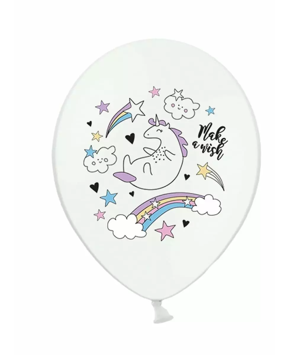 Ønsk deg noe! Dette settet består av 6 lateksballonger. Disse ballongene er hvite med en fin enhjørning og «Ønsk deg noe»-trykk samt en regnbue. Når de er fylt med luft eller helium, måler de omtrent 30 cm. Disse ballongene vil være perfekte for en morsom og finurlig romdekorasjon! Inkludert tilbehør: 6 ballonger Materiale: Lateks