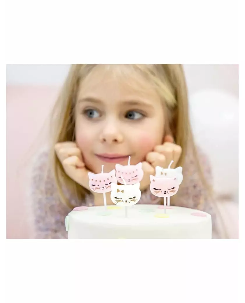 Blås ut noen kattungelys! Dette settet inneholder 6 lys som måler omtrent 2 cm. De er formet som kattungehoder, og du får 4 rosa og 2 hvite! De vil være perfekte til en liten jentes bursdag som elsker kattunger! Inkludert tilbehør: 6 lys
