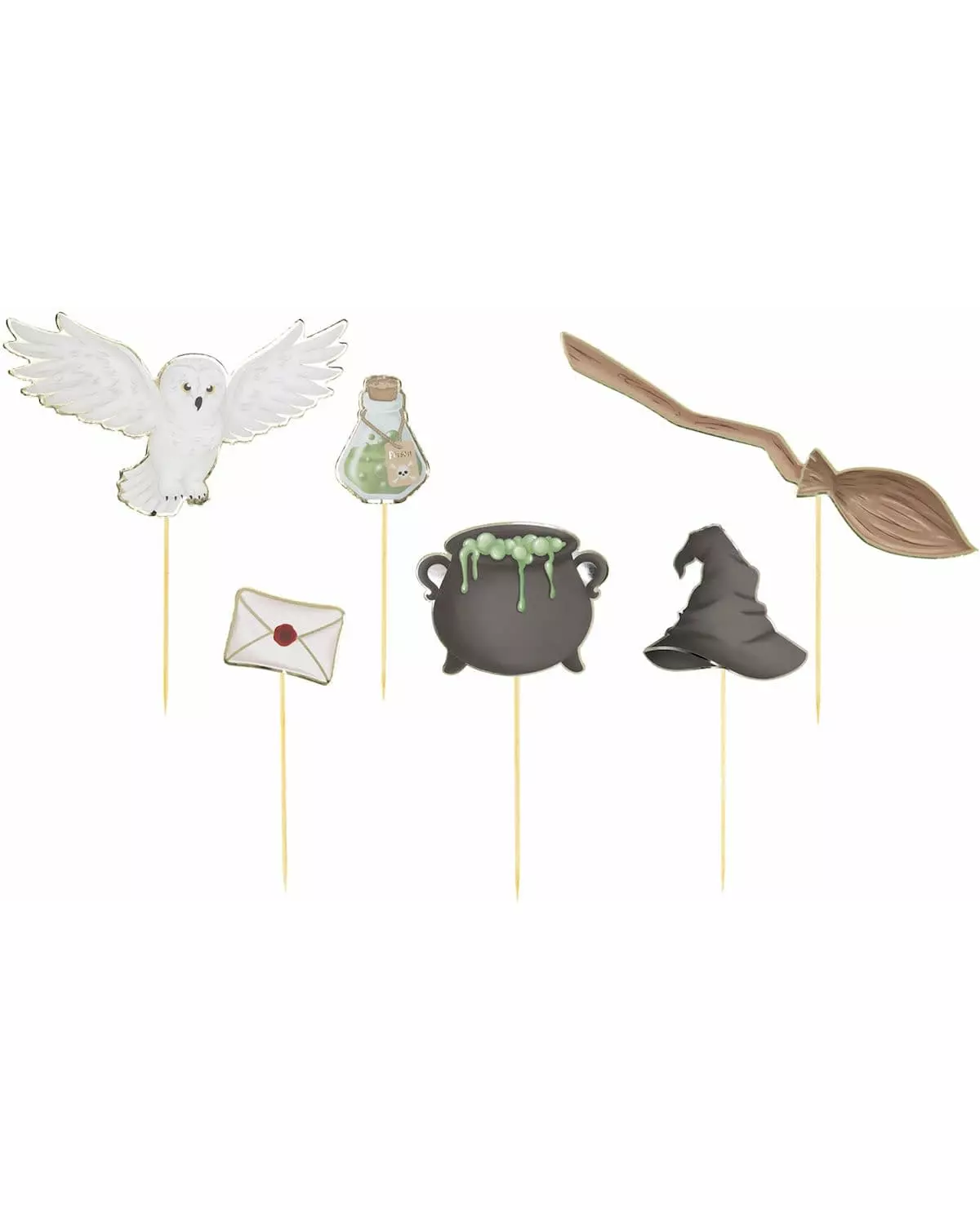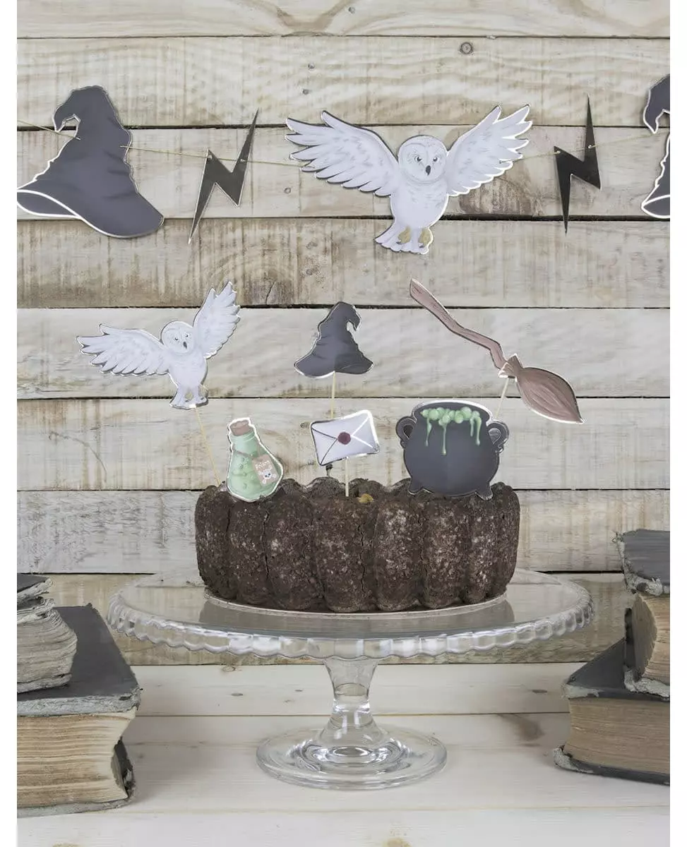 For en kake verdig trollmannsskolen! Disse kakepyntene selges i sett på 6. De representerer en kjele, et brev, en ugle, en eliksir, en kost og en trollmannshatt. De vil fordype bursdagskaken din i trollmennenes verden! Inkludert tilbehør: 6 kakepynt Materiale: Plast Stell: Håndvask