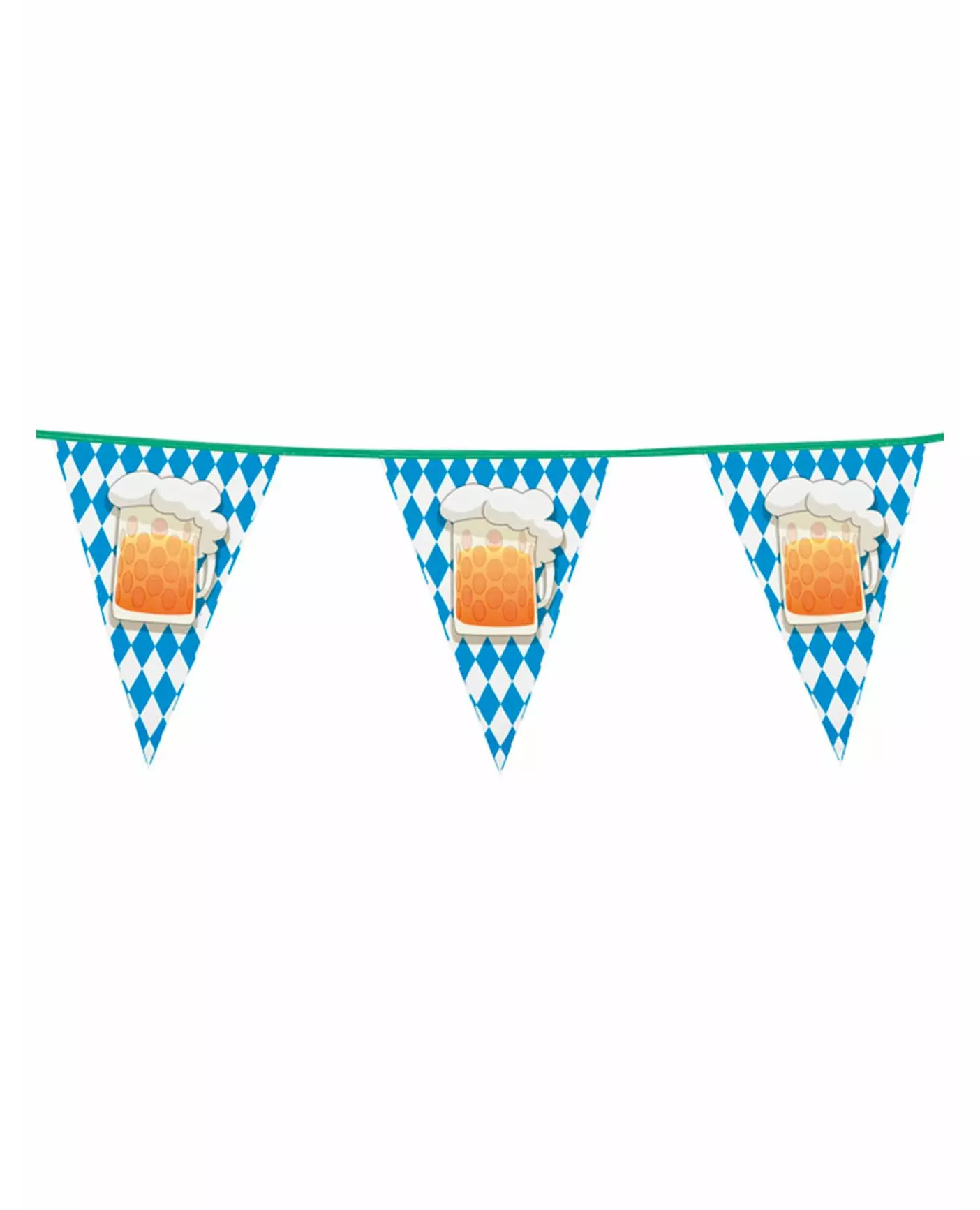 En flott dekorasjon til Oktoberfesten! Denne plastvimpelen måler omtrent 6 m lang. Den er dekorert med vimpler med det bayerske flagget og et ølkrus i midten. Disse vimplene er kun trykt på én side, og måler omtrent 20 x 30 cm. Denne girlanderen vil være perfekt for å fullføre dekorasjonen av rommet ditt til Oktoberfesten. Inkludert tilbehør: Girlander Materiale: Plast