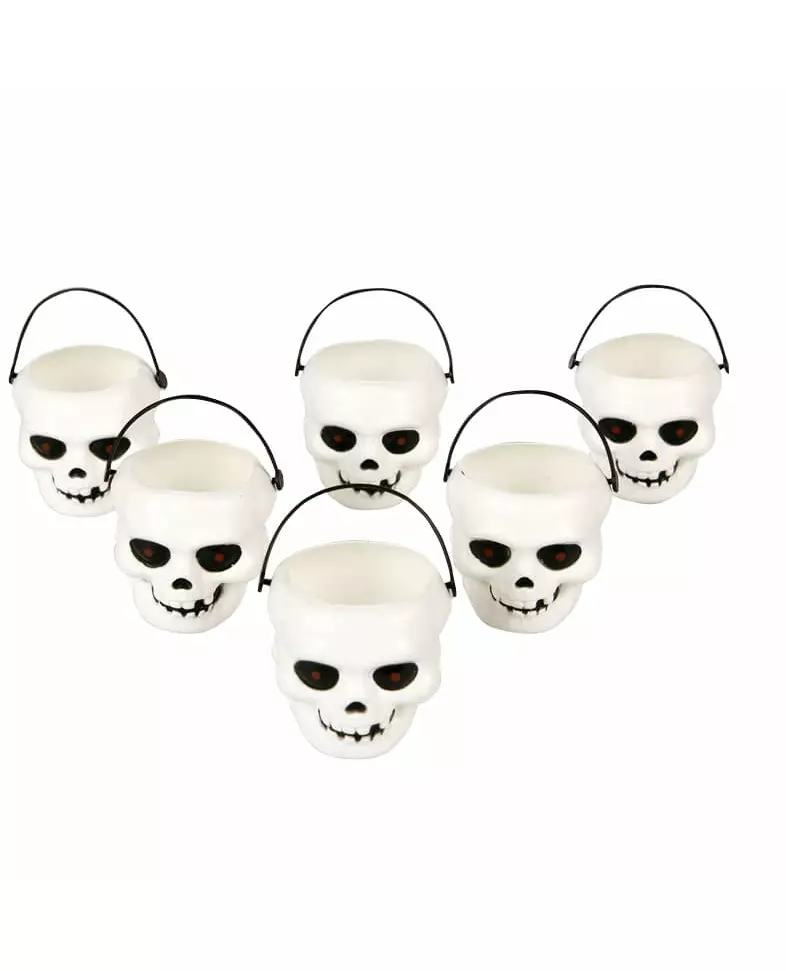 Dødelig! Dette settet består av 6 plastbøtter med hodeskaller som måler omtrent 5,5 x 6,5 cm. Hver bøtte er festet til et håndtak. Legg til litt moro på bordet ditt på kostymefester med skrekktema eller til Halloween. Originalitet garantert! Inkludert tilbehør: 6 bøtter Materiale: Plast