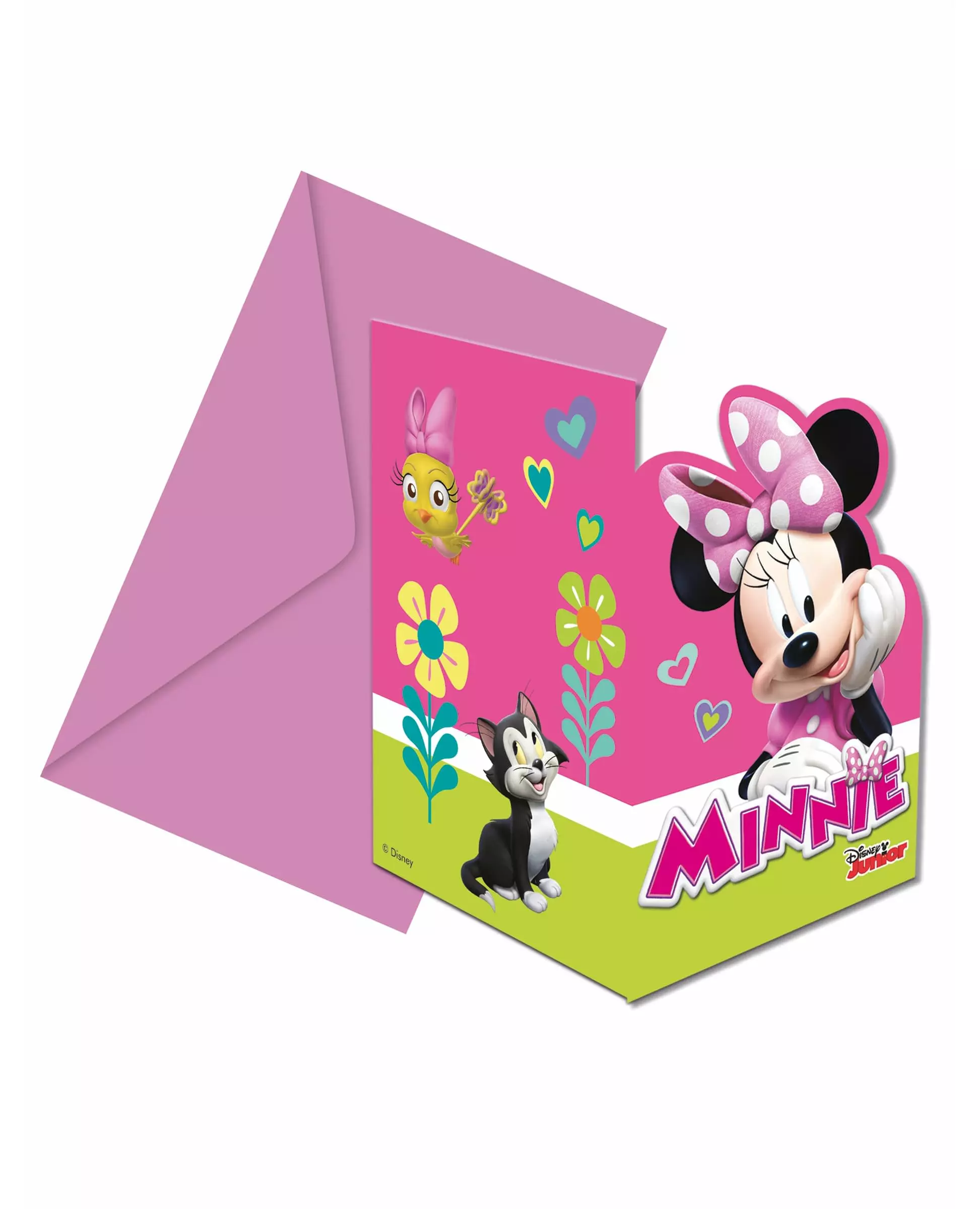 Overraskelsesfest! Dette settet er offisielt lisensiert av Minnie Happy™. Det inneholder 6 invitasjonskort og 6 konvolutter. Invitasjonskortene er laget av papp. De har Minnie på forsiden og er trykt med blomster, hjerter, en gul fugl og katten Figaro på baksiden. Inni kan du skrive diverse nyttig informasjon til festen. Kortene måler omtrent 8,5 x 13,5 cm. Konvoluttene er laget av rødt papir. De måler omtrent 9,5 x 14 cm. Send disse invitasjonene til alle datterens venner til bursdagsfesten hennes! Inkludert tilbehør: 6 invitasjonskort 6 konvolutter Materiale: Papp, papir