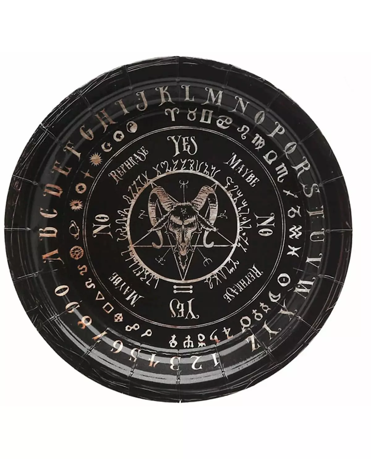 Fordyp gjestene dine i en mystisk atmosfære med våre Ouija-papirtallerkener! Disse 6 Ouija-papirtallerkenene måler omtrent 18 cm i diameter og er dekorert med et mørkt og mystisk mønster, ideelt for å skape en fengslende atmosfære. Designet er inspirert av det berømte Ouija-brettet, og viser bokstaver, tall og esoteriske symboler på en svart bakgrunn, noe som forsterker den mystiske atmosfæren. Disse papirtallerkenene er perfekte for Halloween, og vil gi et spennende preg til bordet ditt og til hver bit. Ingredienser: NC. Inkludert tilbehør: 6 tallerkener Materiale: papp Vedlikehold: Ikke vask