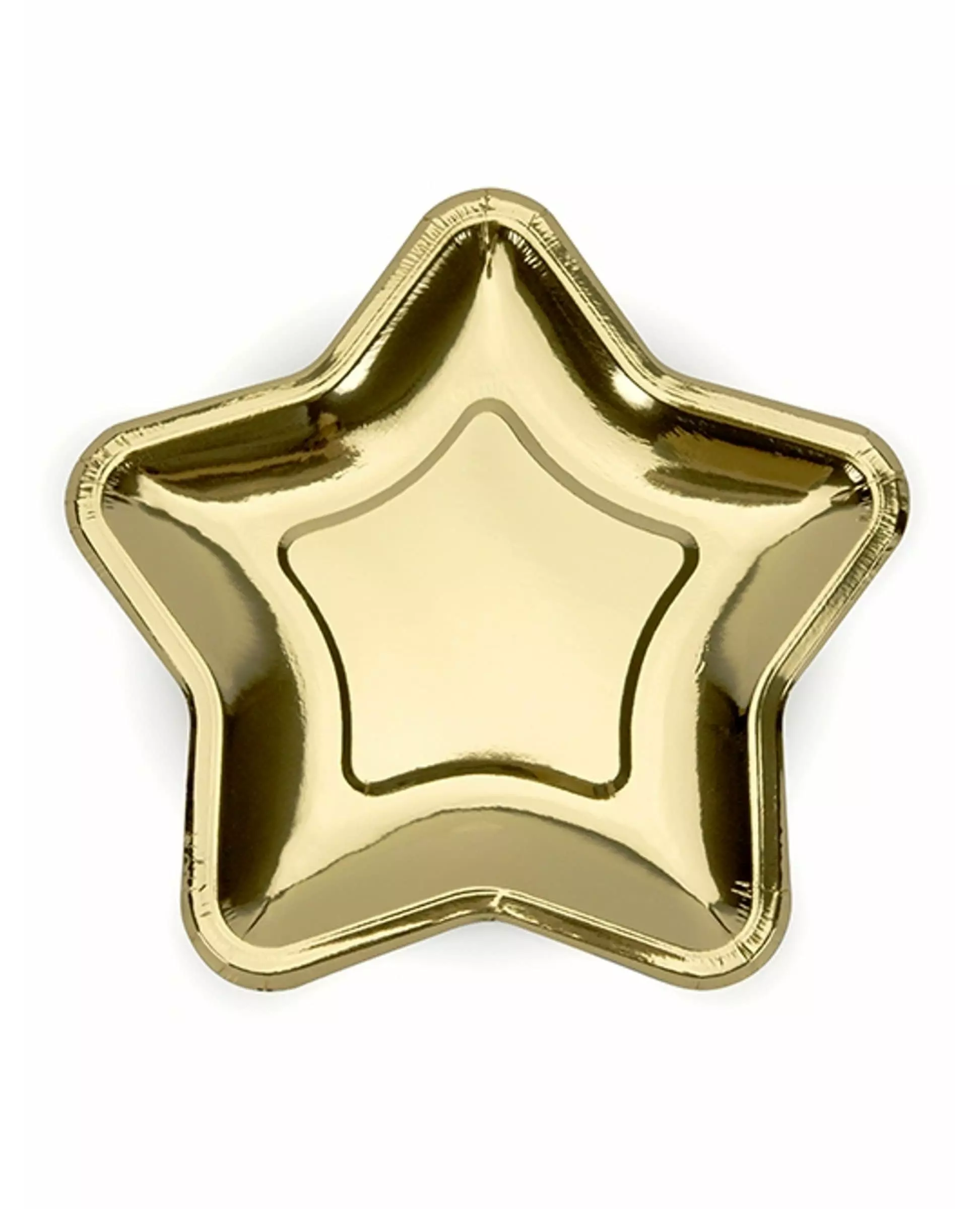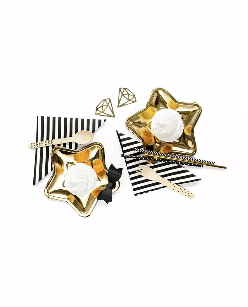 For en stjernespekket dessert! Disse 6 små tallerkenene måler omtrent 18 cm. De er laget av papp og formet som gullstjerner. Dette settet med små stjerneformede tallerkener vil være perfekt for servering av julestokken din til julemåltidet! Inkludert tilbehør: 6 små tallerkener Materiale: Papp