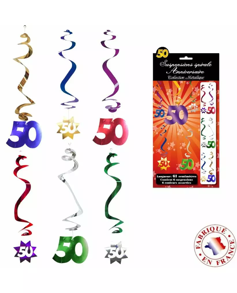 Sett med 6 anheng i seks assorterte farger, 61 centimeter lange. Hver virvel avsluttes med tallet «50». Denne dekorasjonen er ideell for å pynte opp rommet ditt. 100 % fransk produkt. Inkludert tilbehør: 6 anheng