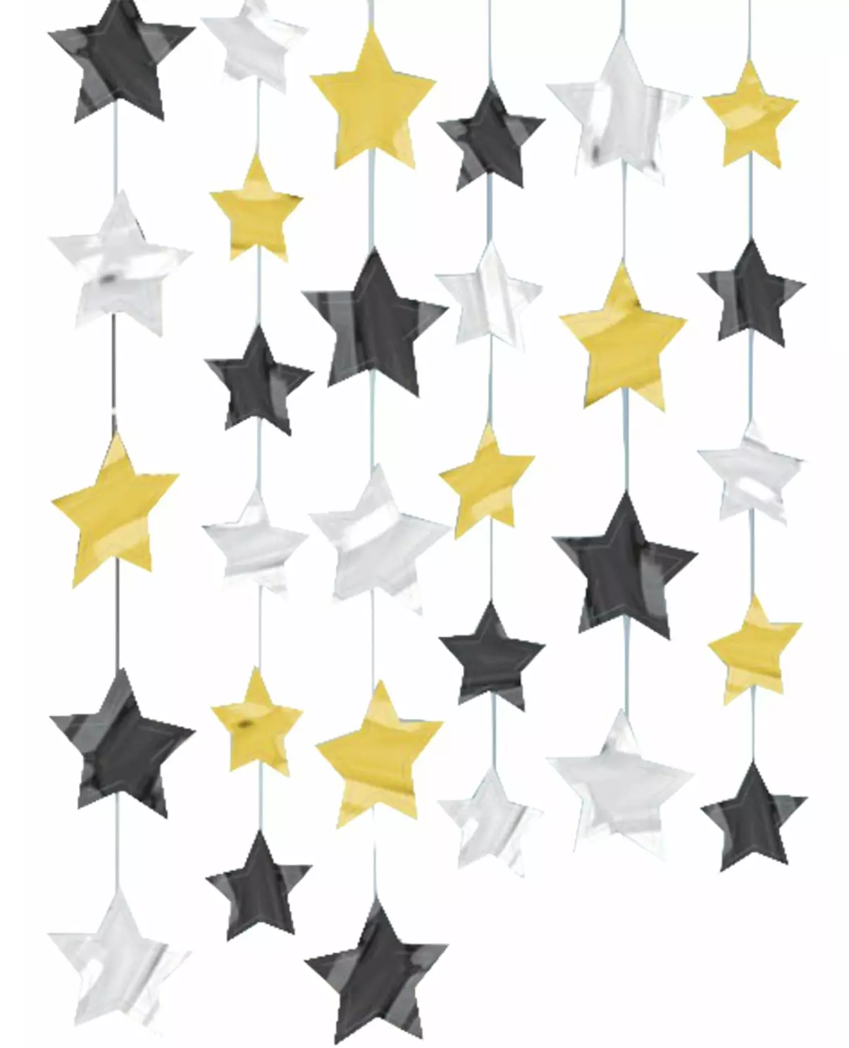Perfekt for stjernedekorasjon! Sett med 6 stjerneanheng. Hvert anheng måler omtrent 2,13 meter og hver stjerne er omtrent 10 cm bred. Ideell for dekorasjon på temafester eller andre arrangementer. Inkludert tilbehør: 6 anheng. Materiale: Plast.