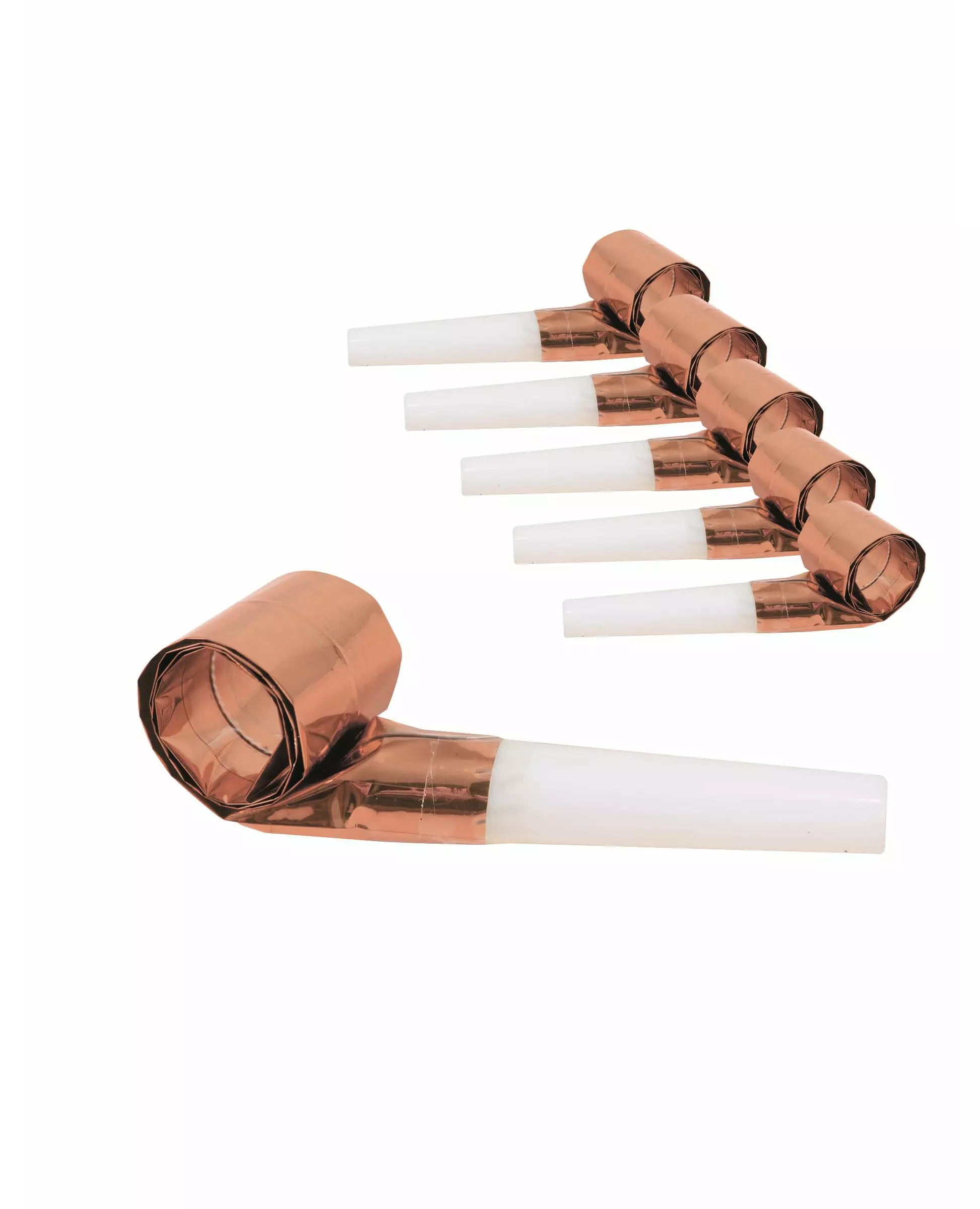 Rosegull festpoppere! Denne pakken inneholder 6 rosegullpoppere. Du kan blåse i dem med plastdysen. De måler omtrent 4 x 30 cm når de er utbrettet. Ha det gøy med å lage lyd på en bursdags- eller nyttårsfest med disse popperne! Inkludert tilbehør: 6 poppers Materiale: Plast