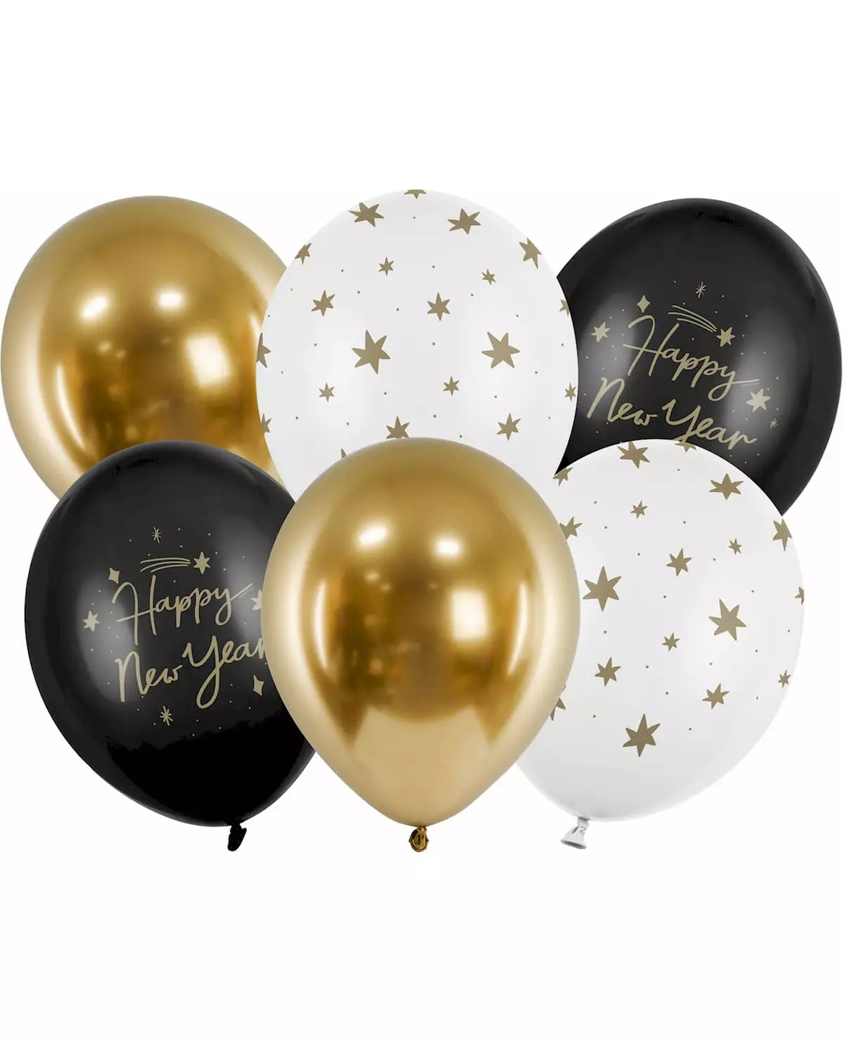 6 svarte og gullfargede ballonger til godt nyttår, 30 cm