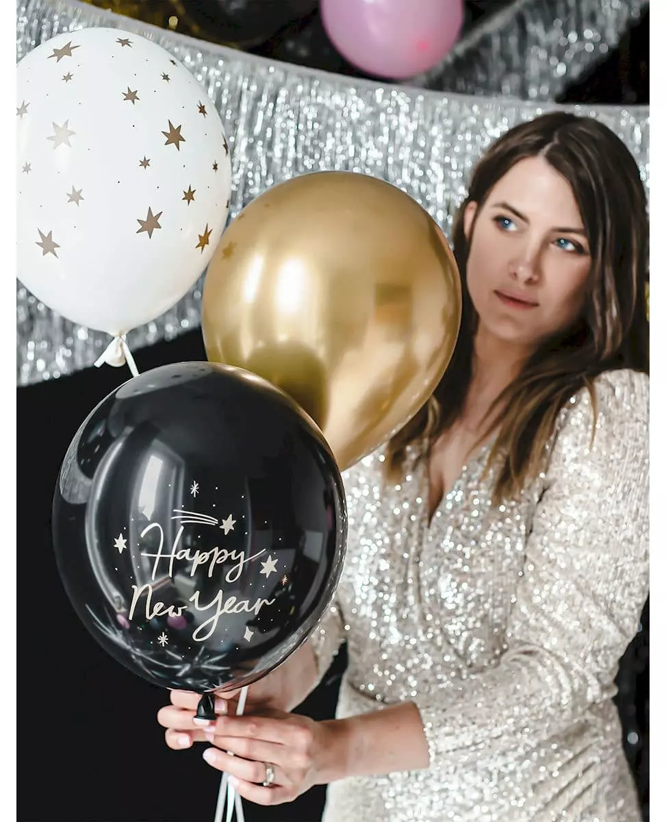 Dine ballonger til det nye året! Dette settet består av 6 lateksballonger som måler omtrent 30 cm når de er oppblåst. Du finner 2 gullballonger med matt effekt, 2 hvite ballonger med gullstjerner og 2 svarte ballonger med påskriften «Godt nytt år» i gullbokstaver. Dette settet vil være ideelt for å fullføre dekorasjonen din til det nye året med venner eller familie! Inkludert tilbehør: 6 ballonger Materiale: Lateks