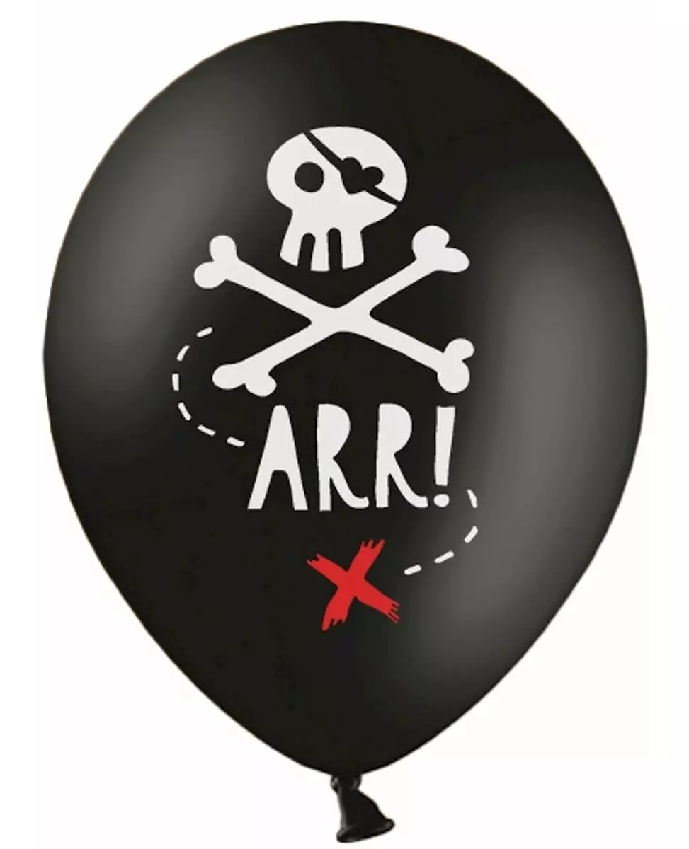 Alle om bord! Disse piratballongene i lateks selges i pakker på 6. De måler omtrent 30 cm når de er oppblåst. De er svarte med piratmotiver som en hodeskalle og en sti som fører til skatten! Disse ballongene vil være perfekte til dekorasjon på en pirattemafest! Inkludert tilbehør: 6 ballonger Materiale: Lateks