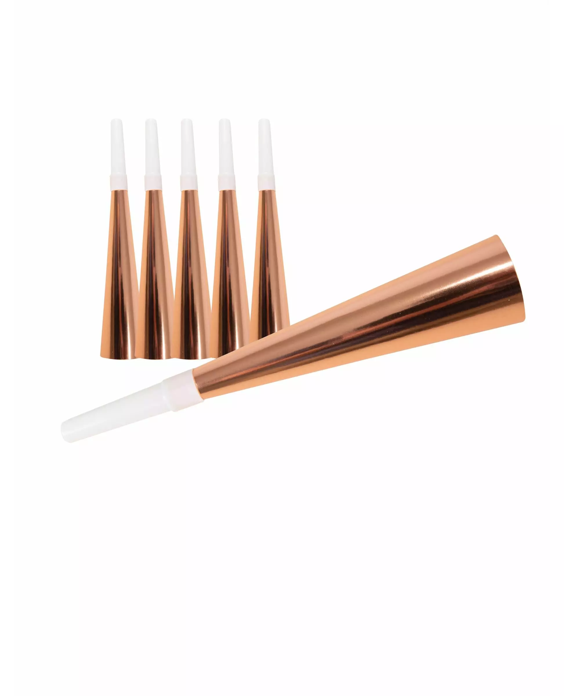 Trompeter til festen! Dette settet består av 6 trompeter i roségull i papp. De er omtrent 19 cm lange. Lag litt lyd og liv opp en bursdags- eller nyttårsfest med disse trompetene! Inkludert tilbehør: 6 trompeter Materiale: Papp