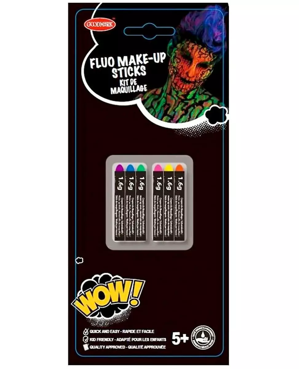 Fluorescerende under UV-lampe! Dette settet inneholder 6 fettblyanter i grønt, oransje, rosa, lilla, gult og fuchsia. De måler omtrent 5 cm i lengden. Sminken på huden vil fluorescere når den utsettes for UV-lys. Dette settet vil være perfekt for karneval eller andre festlige arrangementer. Tilbehør inkludert: 6 blyanter