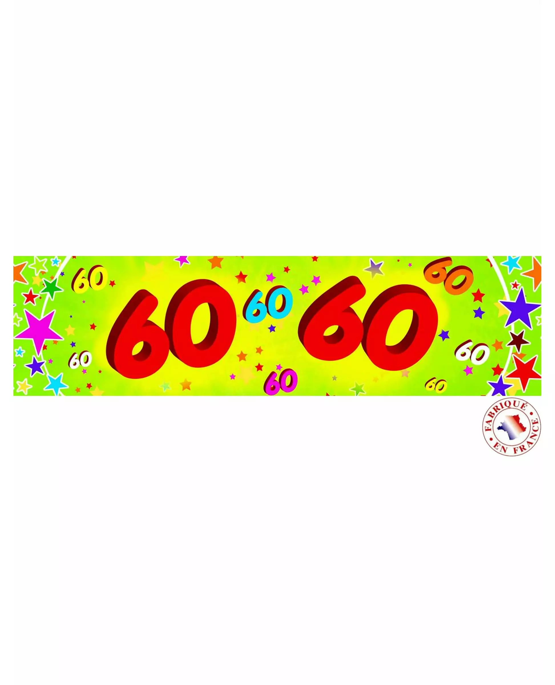 Feir 60-årsdagen din på en skikkelig måte med en fargerik dekorasjon! Dette 60-årsbanneret er laget av papir. Gult og grønt, det måler 16 cm i høyden og 2,44 cm i lengden. Det har et trykk med tallene 60 og små flerfargede stjerner. Dette banneret vil være perfekt for å gi et preg av farge til romdekorasjonen din til 60-årsdagen din! Laget i Frankrike. Inkludert tilbehør: 1 banner Materiale: Papir