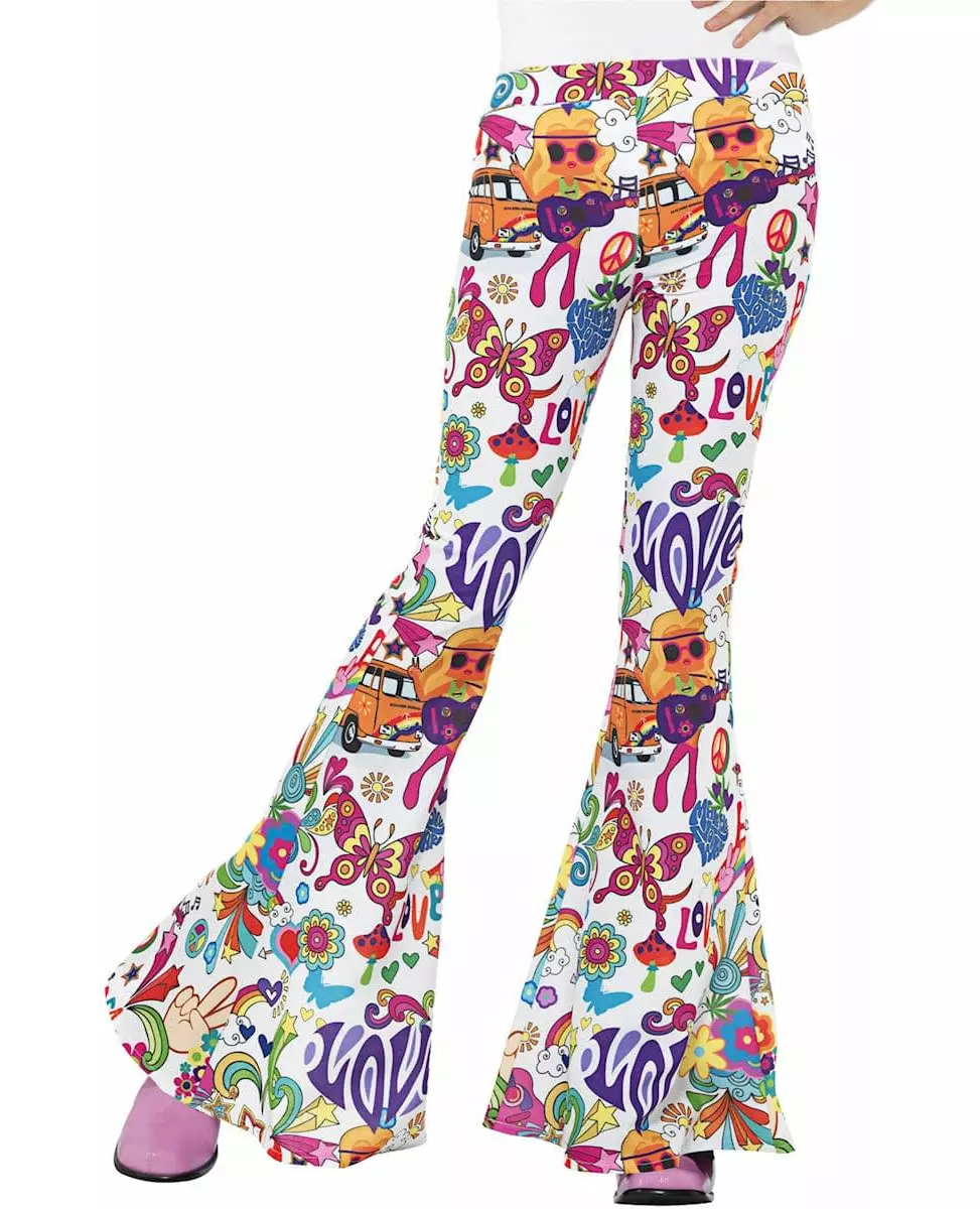 Et vakkert hippie-trykk! Disse buksene i 60-tallsstil er for kvinner. De har en utsvingt fasong. De er trykket med et pent, fargerikt hippie-mønster. Ordet «Love» er avbildet forskjellige steder på buksene. De vil være ideelle for å fullføre hippie-kostymet ditt til en fest med 60-/70-tallstema! Inkludert tilbehør: Bukser Materiale: 100 % polyester 100 % polyester 100 % polyester 100 % polyester 100 % polyester 100 % polyester