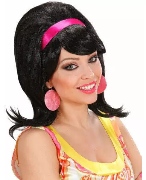 Sekstitalls pin-up Denne svarte 60-tallsparykken inkluderer et rosa satengbånd (smykker og klær er ikke inkludert). Den går ned til skuldrene og er utrolig voluminøs! Denne 60-tallsparykken er perfekt for en temafest eller et karneval. Matchende kostymer er tilgjengelig i butikken. Inkludert tilbehør: parykk Materiale: 100 % polypropylen Stell: Håndvaskbar
