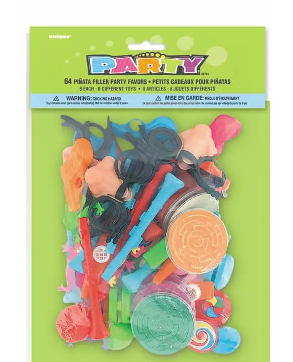 Ideelt til piñataen din! Dette settet med 64 små gaver er ideelt for å fylle en piñata, for eksempel. Det består av 8 leker i 8 eksemplarer: nesebriller, marmorlabyrint, minifrisbee, hoppende frosk, klapp-klapp, minipistol, snurrebass og yoyo. Disse små gavene vil være perfekte å gi til alle barn under en bursdagsaktivitet! Inkludert tilbehør: 64 små leker Materiale: Plast