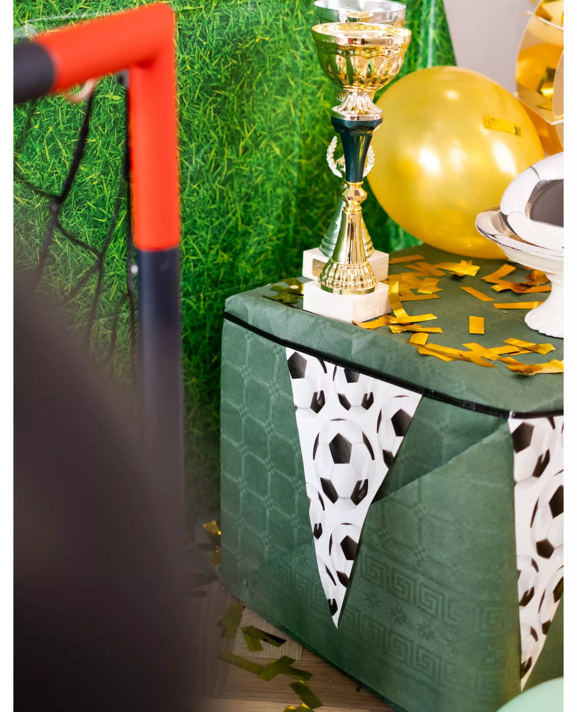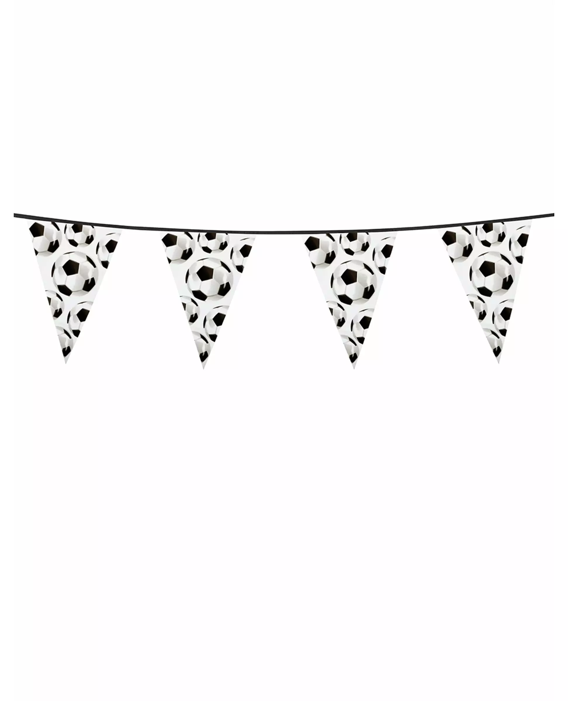 Videre til seier! Denne omtrent 6 meter lange girlanderen består av trekantede vimpler som måler omtrent 20 x 30 cm. Vimplene er trykt med fotballer. Du kan enkelt henge girlanderen din fra endene. Denne girlanderen vil være perfekt for alle dine fotballtemafester, bursdager eller måltider under fotball-VM! Inkludert tilbehør: 1 girlander Materiale: Papp