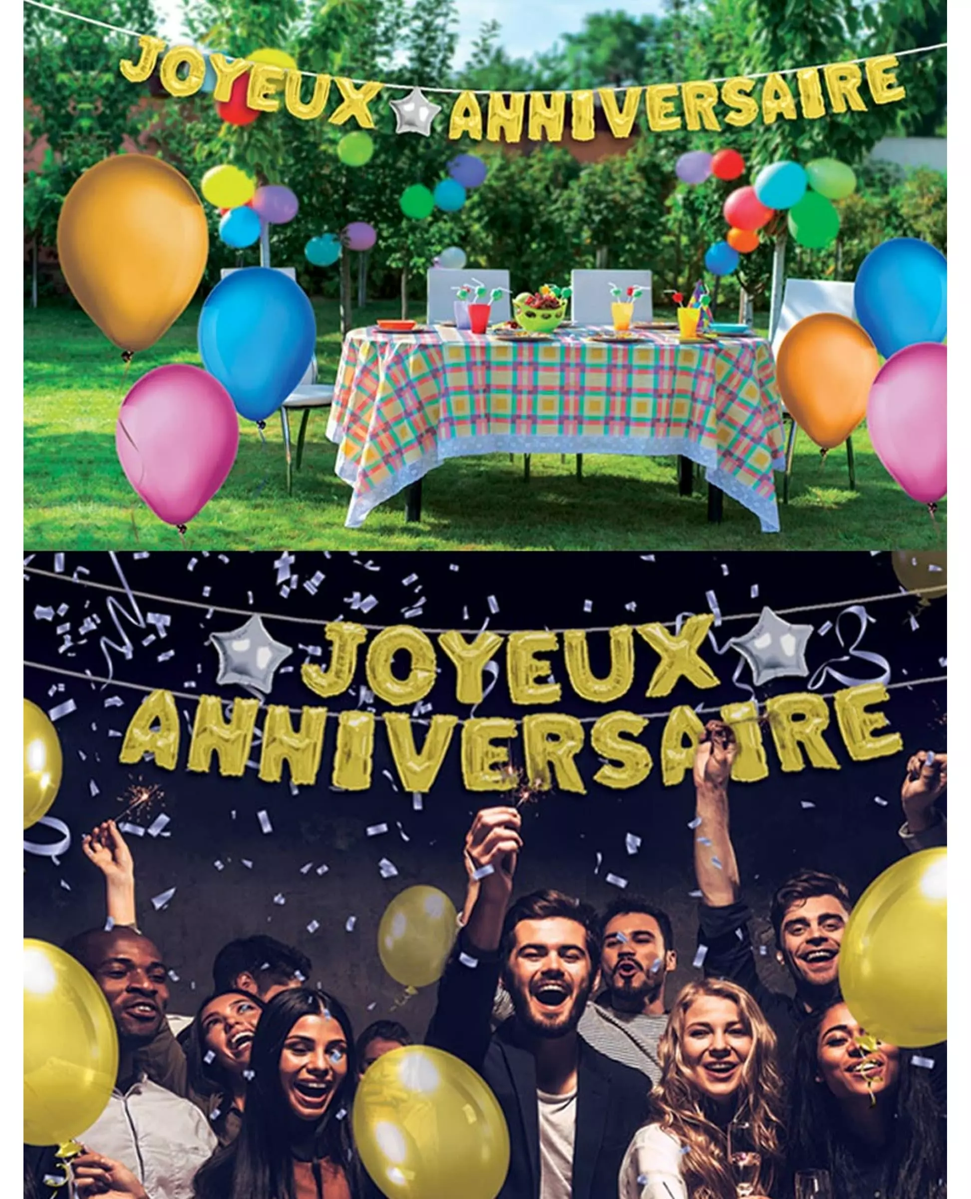 Gratulerer med dagen! Denne girlanderen består av 20 ballonger og måler omtrent 6 meter i lengde. Ballongene er gullfargede og formet som bokstaver for å danne «HAPPY BIRTHDAY»! Du vil få 2 sølvstjerneballonger. Et sugerør er inkludert for å enkelt blåse opp disse ballongene. Denne ballonggirlanderen vil være ideell for å lage en vakker dekorasjon i et rom eller en hage til en bursdag!. Inkludert tilbehør: Girlander Materiale: Aluminium