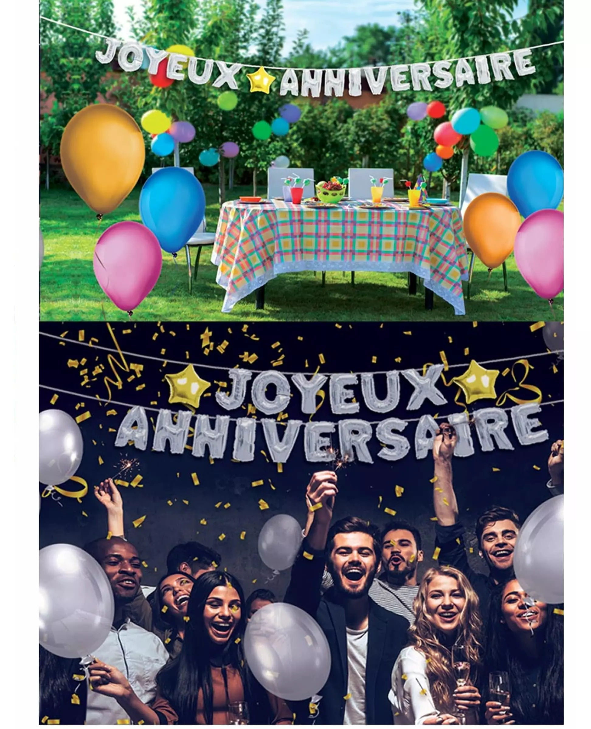 For en sølvfarget bursdag! Denne girlanderen inneholder 20 aluminiumsballonger som måler 6 meter lange. Ballongene former ordene «Gratulerer med dagen» med sølvfargede bokstaver. Du får også to gullstjerneballonger. Et sugerør er inkludert for å lette oppblåsingen. Denne girlanderen vil være perfekt for innendørs eller utendørs dekorasjon under en sølvtema-bursdag, for eksempel!. Inkludert tilbehør: Girlander Materiale: Aluminium