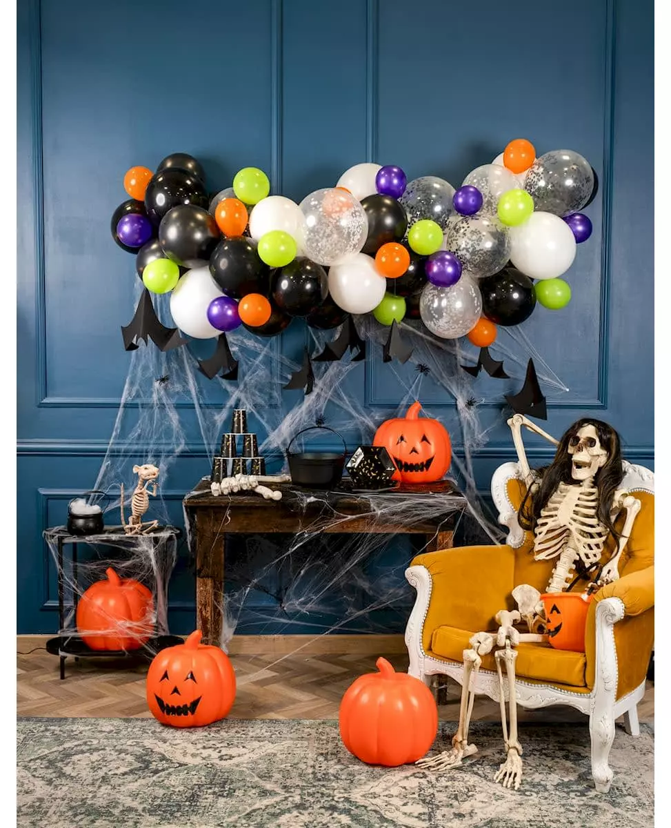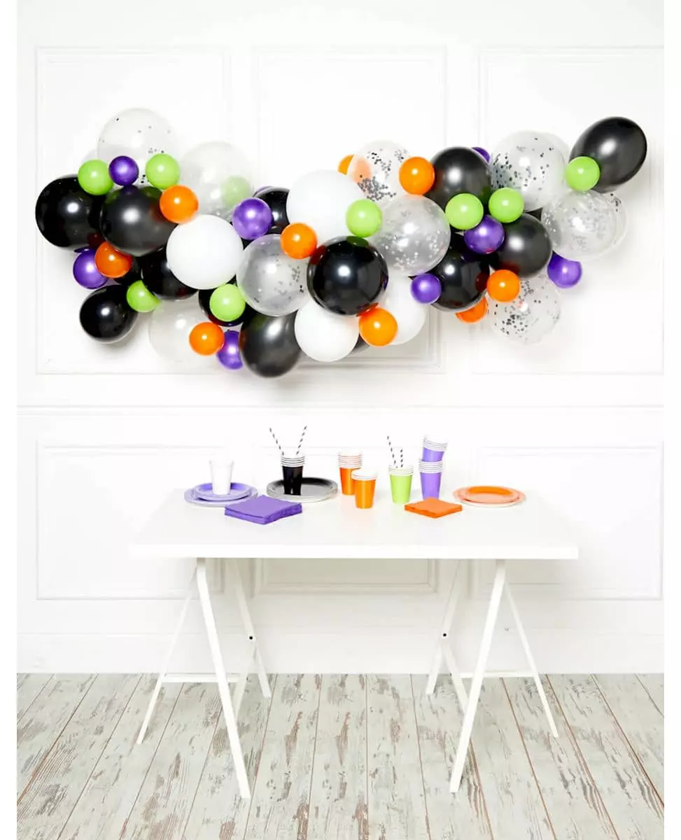 En bue for din grøsserkveld! Denne buen med 70 Halloween-ballonger måler omtrent 4 meter. Den består av 70 ballonger i Halloween-farger, inkludert: - 32 hvite og svarte lateksballonger (28, 35 cm) - 30 oransje, grønne og lilla lateksballonger (12 cm) - 8 konfettiballonger (28 cm) Selvklebende prikker og et ballongbånd følger også med. Du kan enkelt lage din egen Halloween-bue med dette fine settet med ballonger i flere farger og ved hjelp av det medfølgende båndet. Du kan blåse dem opp med luft eller helium ved hjelp av et sugerør. Fullfør romdekorasjonen din på Halloween-temaarrangementet ditt! Inkludert tilbehør: 70 ballonger Selvklebende puter Ballongteip Materiale: Aluminium Vedlikehold: Ikke vask