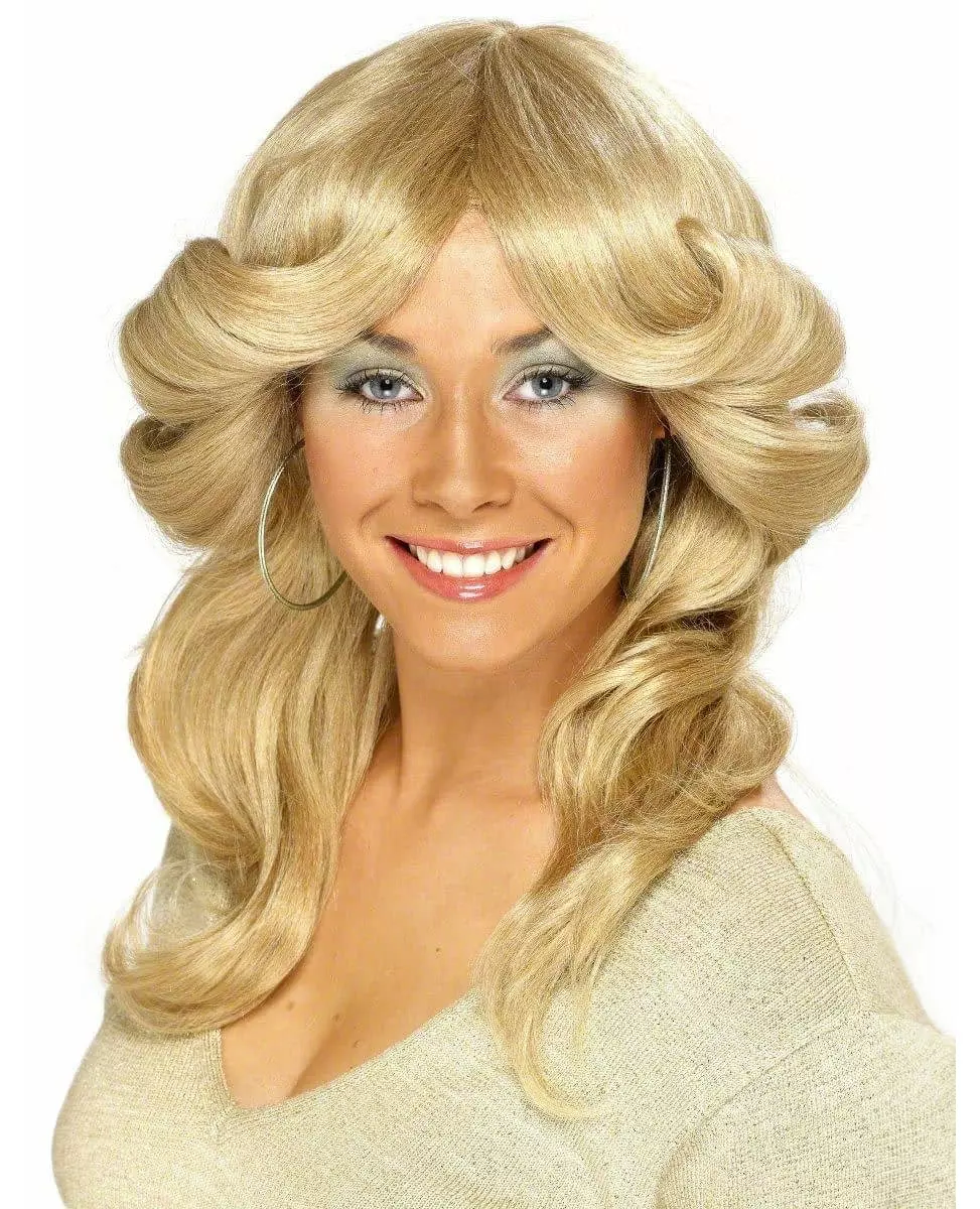 Bølgeeffekter! Denne parykken for kvinner representerer elegant 70-tallet. Den er bølget og blond i fargen. Den vil være ideell for å fullføre kostymet ditt og live opp kostymefester med venner. Materiale: 100 % polyetylen 100 % polyetylen