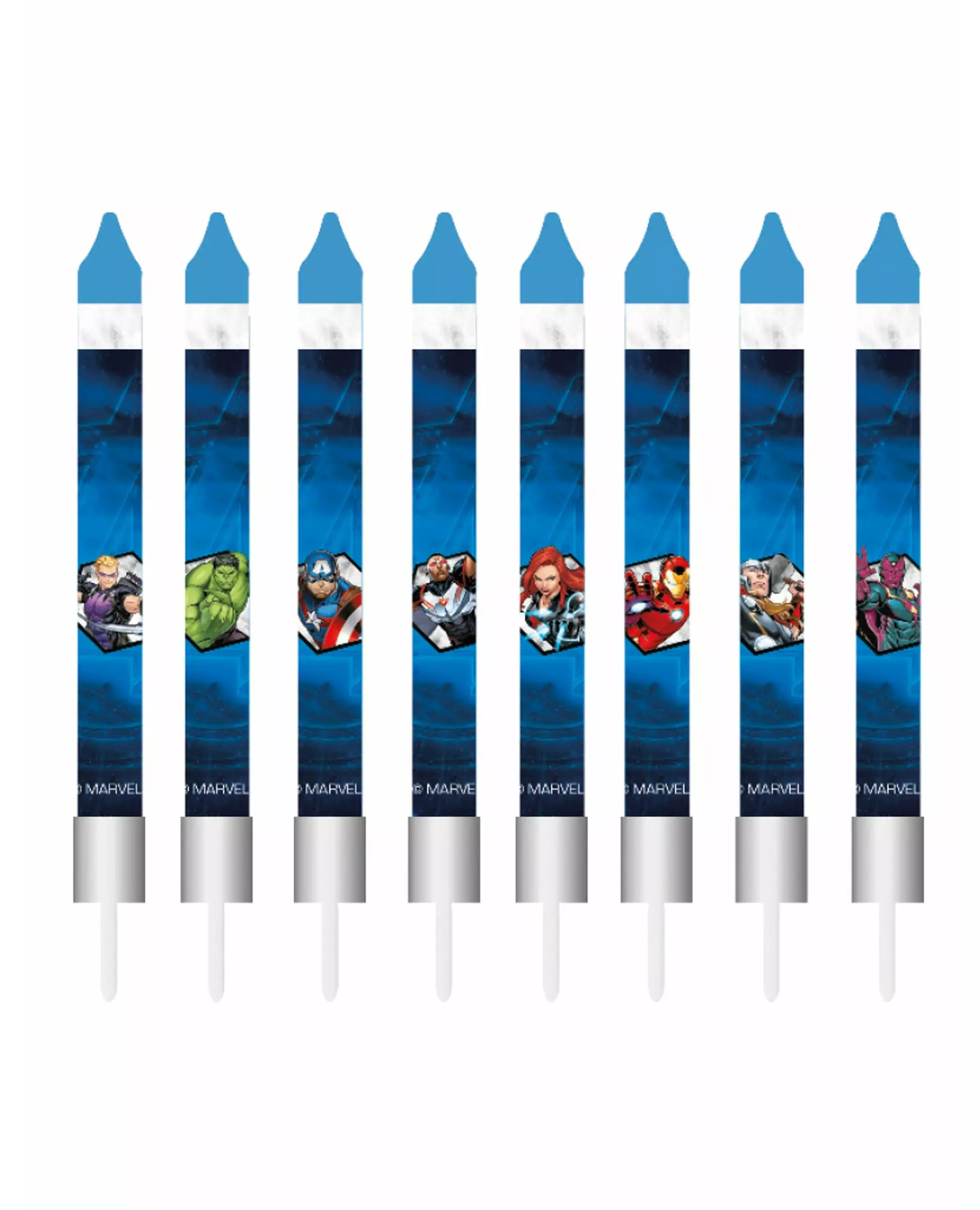 En bursdag med Avengers! Disse offisielt lisensierte Avengers-lysene selges i pakker på 8. De er blå i fargen og måler omtrent 10 cm. De selges med bobéche. Du finner portrettet av medlemmene av Avengers på dem: Captain America, Thor, Iron Man, Hulk ... Disse lysene vil være perfekte for å feire bursdagen din med dine favoritt Marvel-superhelter! Inkludert tilbehør: 8 lys med bobéche Materiale: Voks, plast
