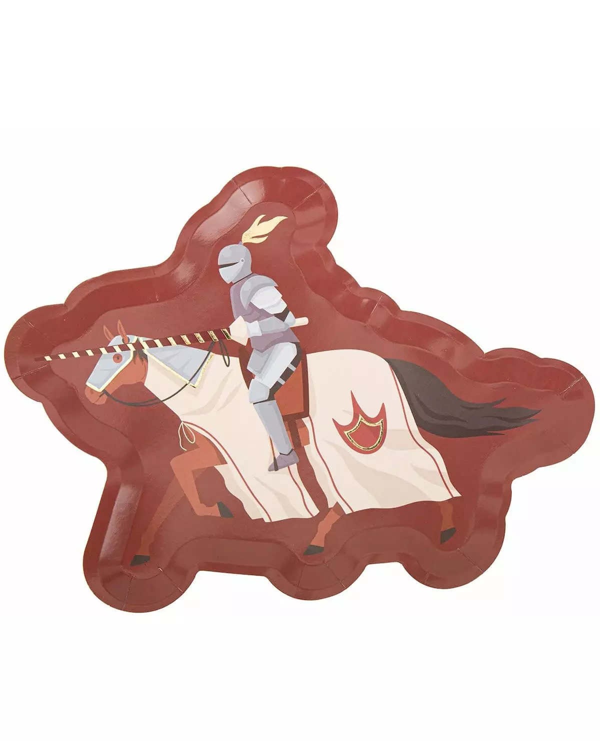 Perfekte tallerkener til en modig ridderbursdag! Disse tallerkenene er laget av papp og selges i pakker på 8. De er burgunderfargede og formet som en ridder som stormer frem på hesten sin. De måler omtrent 28 x 22 cm. Disse riddertallerkenene vil være ideelle som supplement til buffeten på en middelalderfest! Inkludert tilbehør: 8 tallerkener Materiale: Papp