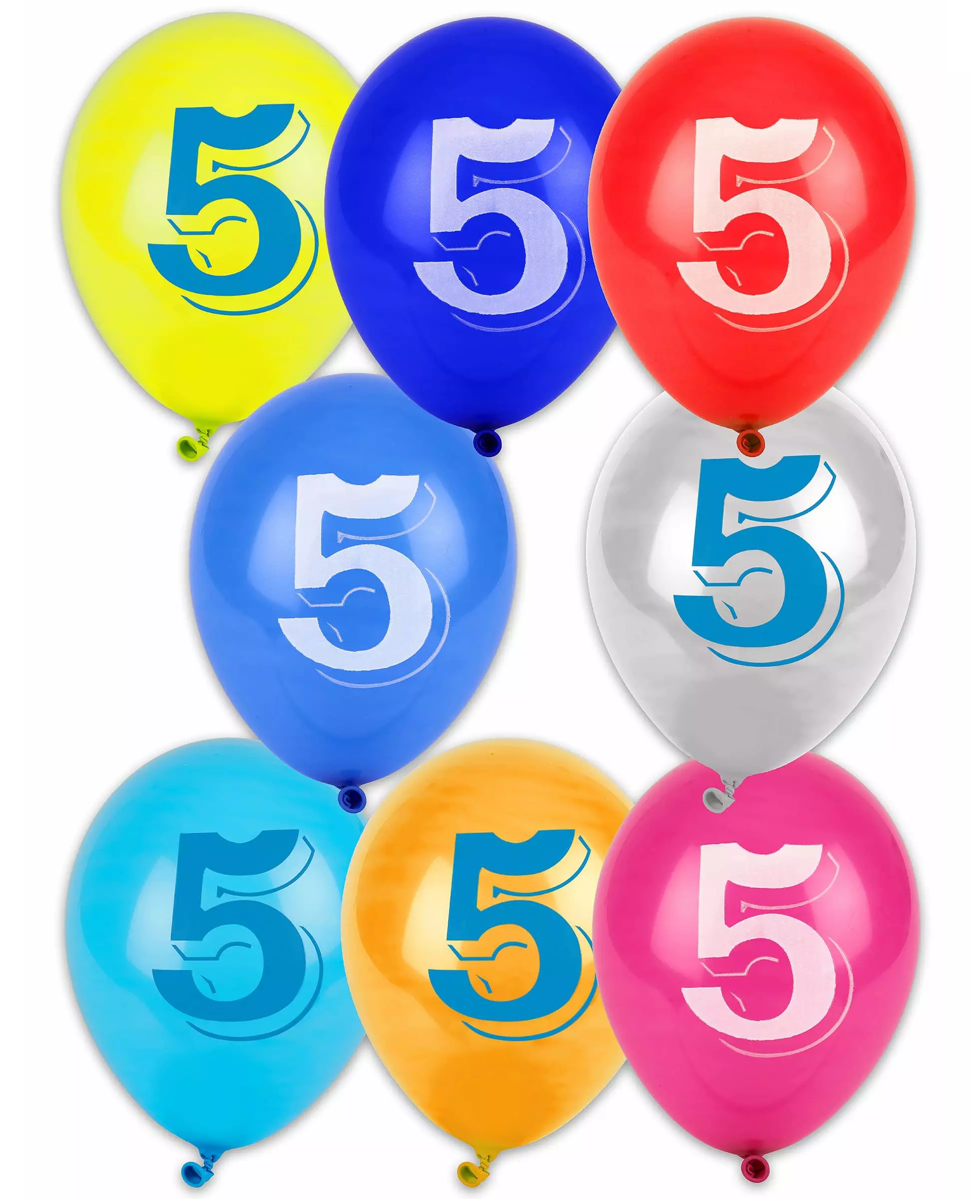ballonger Dette settet består av 8 ballonger med tallet 5 skrevet på dem. Fargene på ballongene er fordelt tilfeldig. Disse ballongene er laget av naturgummi og er fullstendig biologisk nedbrytbare. Dette settet vil være perfekt for å fullføre bursdagsdekorasjonen din. Inkludert tilbehør: 8 ballonger