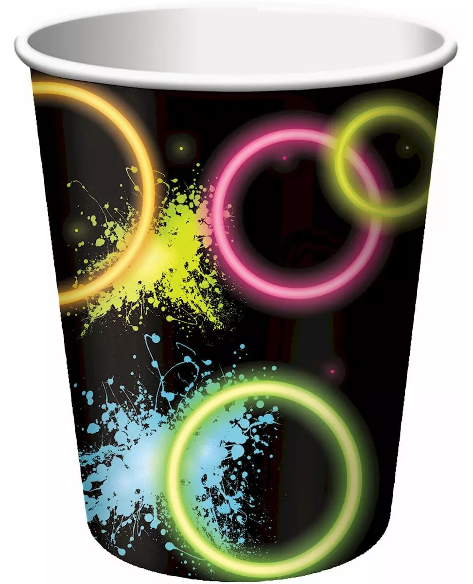 Et lysstoffrørsbord for en lys kveld! Dette settet består av 8 pappkopper. Hver kopp på 266 ml er svart og dekket med flerfargede og lysstoffrørsirkler og prikker. Du kan for eksempel dekke et bord fullt av lys og moro for en kveld med et 80-tallstema! Inkludert tilbehør: Kopper Materiale: Papp